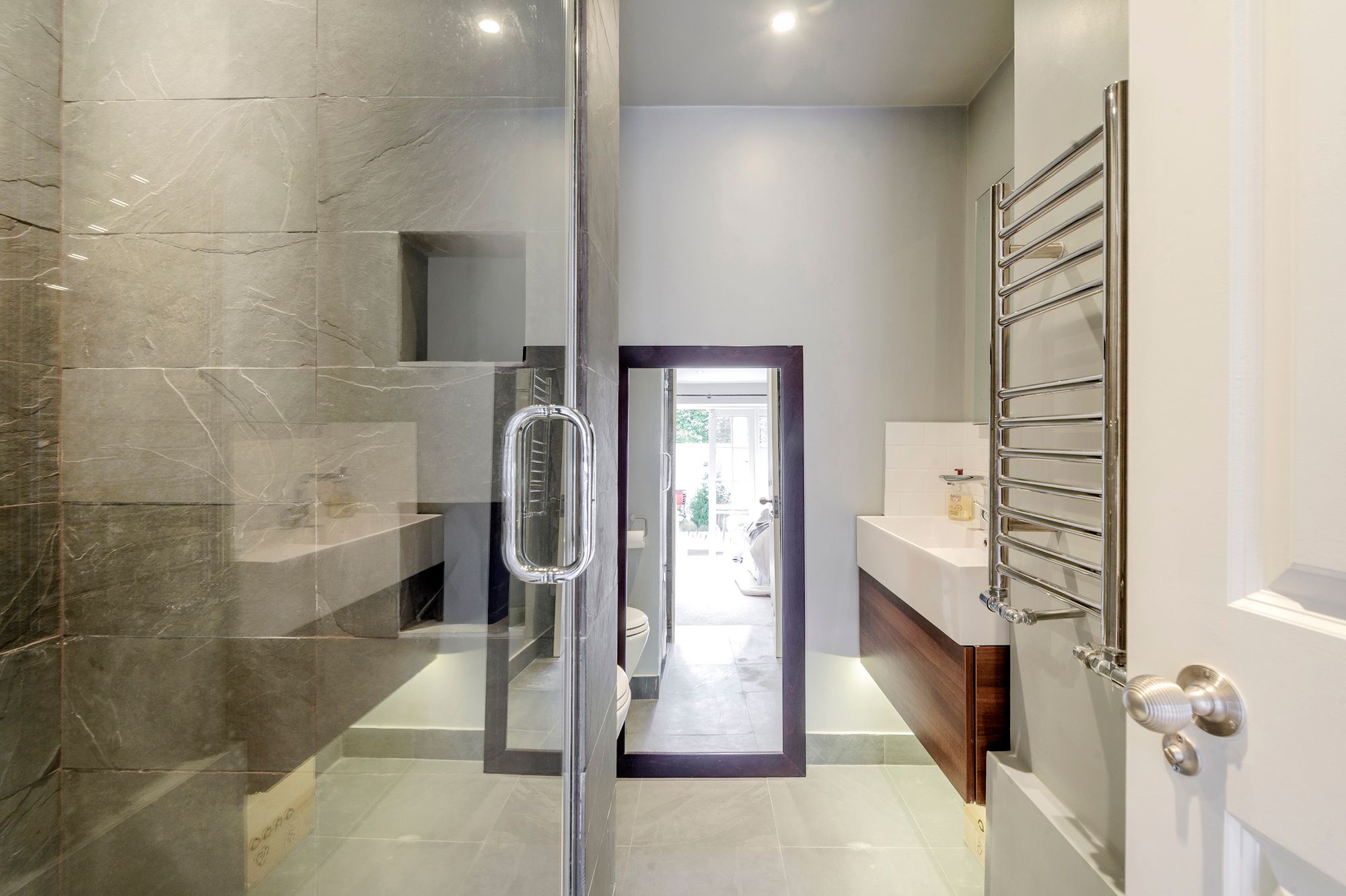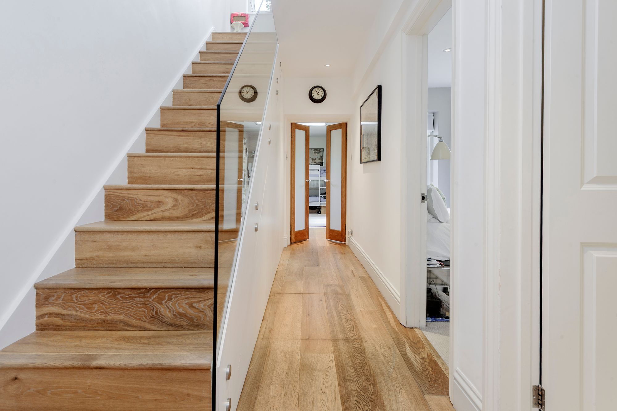 The ground floor immediately impresses with its sense of light and calm. Three well-proportioned bedrooms sit across the ground floor, each finished with oak flooring and bespoke wardrobes. The principal suite opens directly onto the garden and includes a sleek en suite shower room. A family bathroom, utility space with butler sink, and generous storage complete the accommodation.