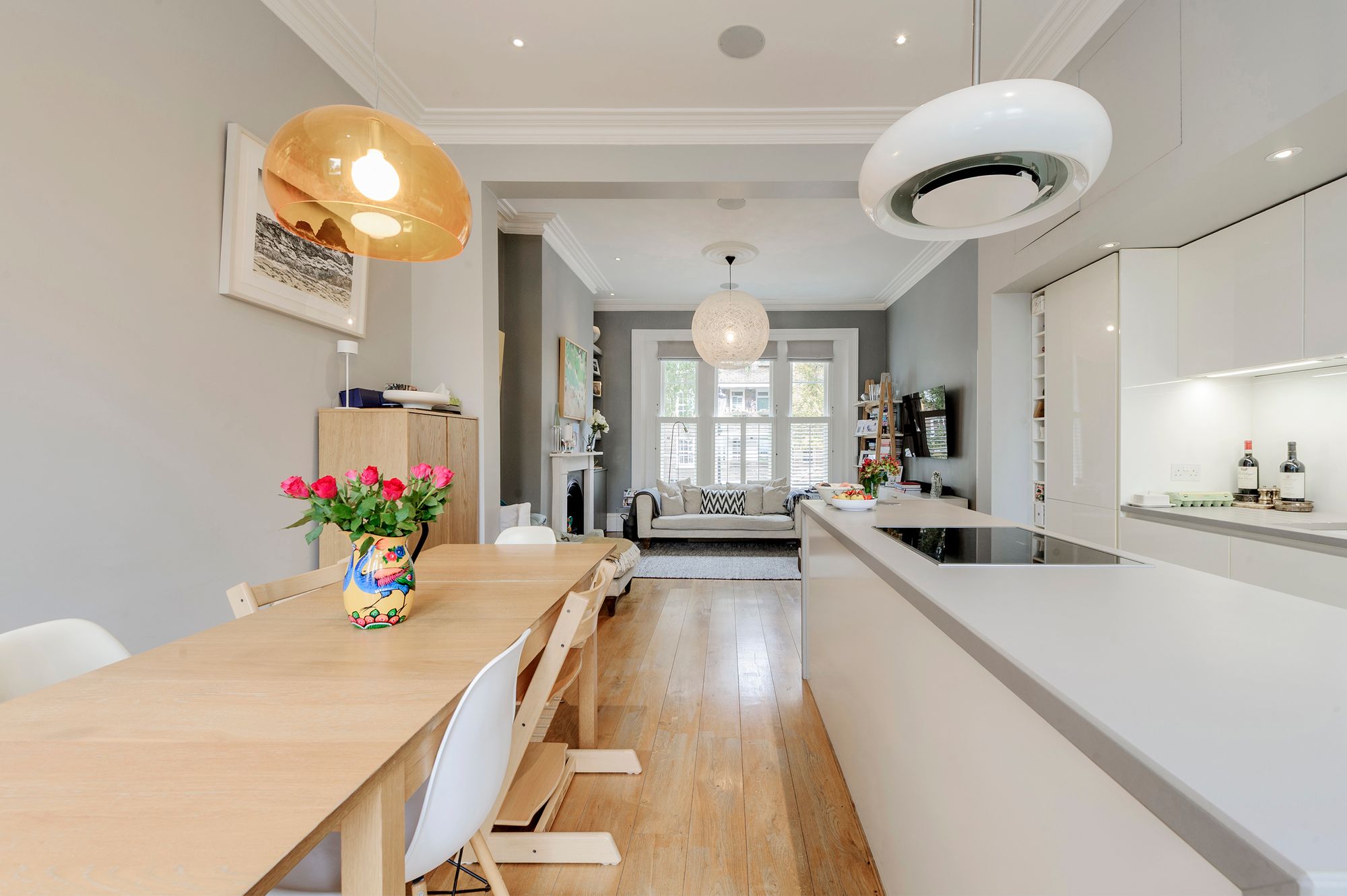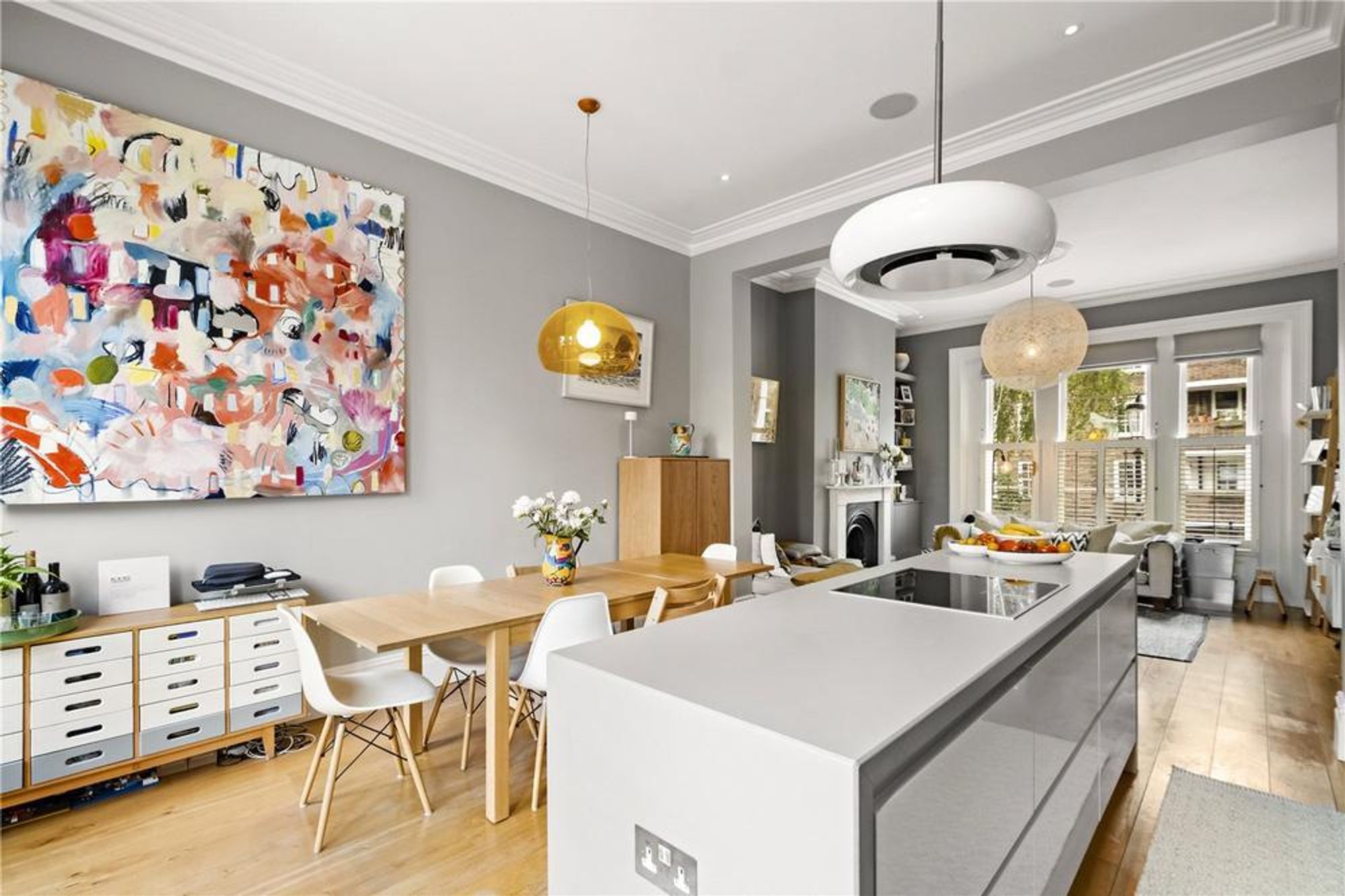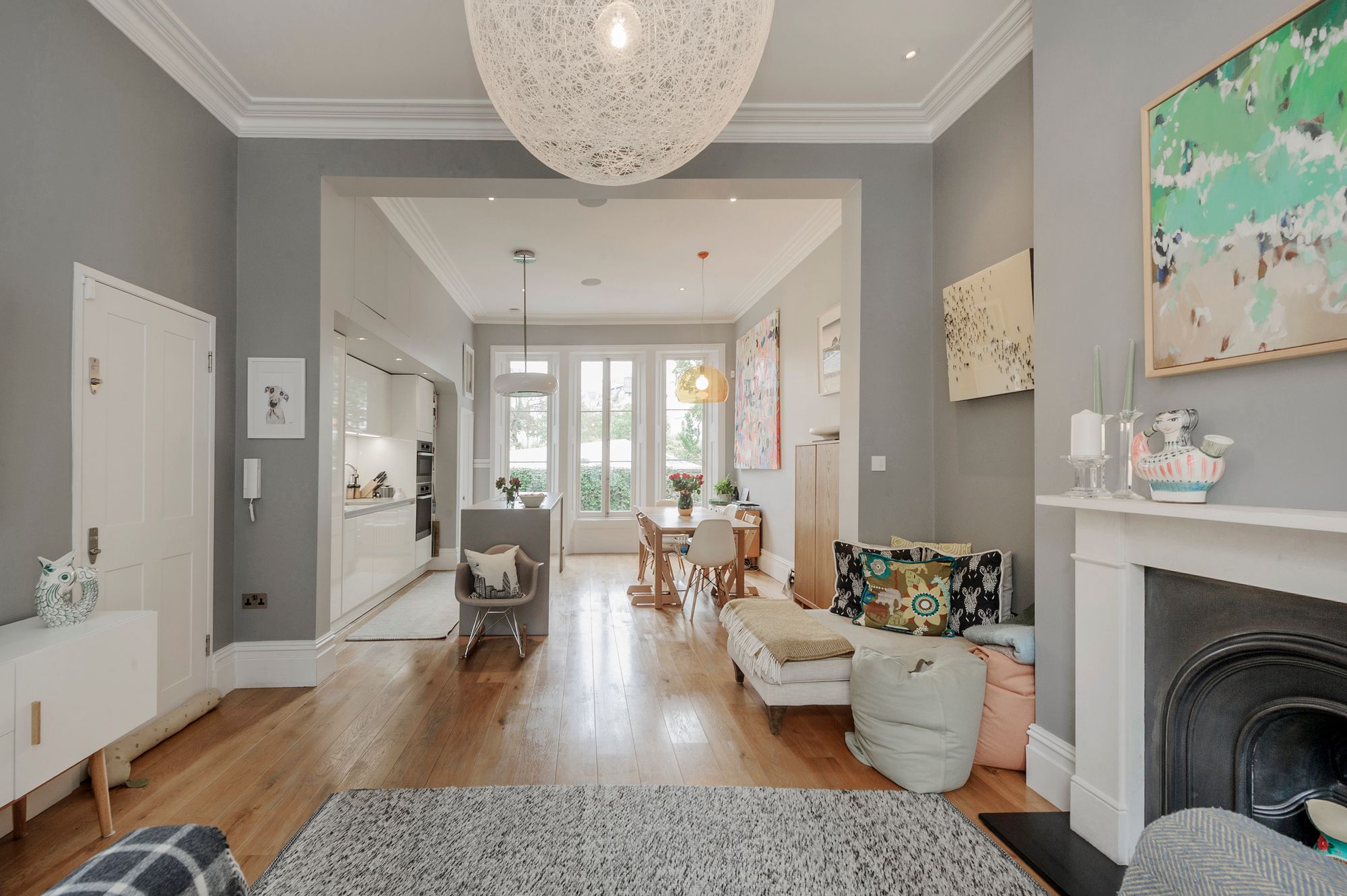 Entering at raised ground floor, the apartment unfolds into an exceptional open-plan kitchen and reception room, a beautifully resolved space defined by soaring ceilings, full-height windows, and an abundance of natural light. The kitchen is crafted around a central island with integrated Miele and Siemens appliances and clean architectural lines. At the front, a relaxed sitting area centres on a classic fireplace, with a separate entrance offering welcome versatility.
