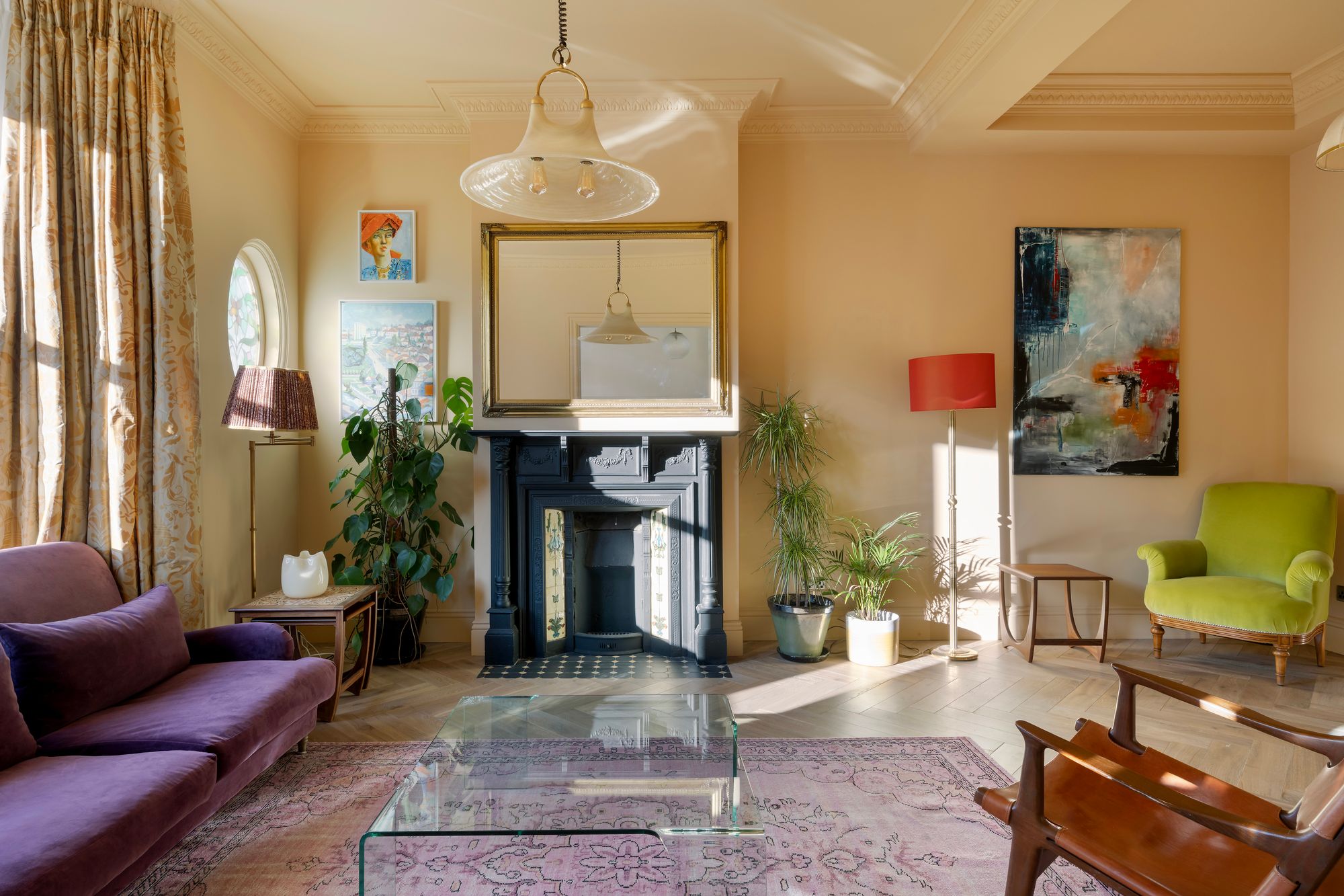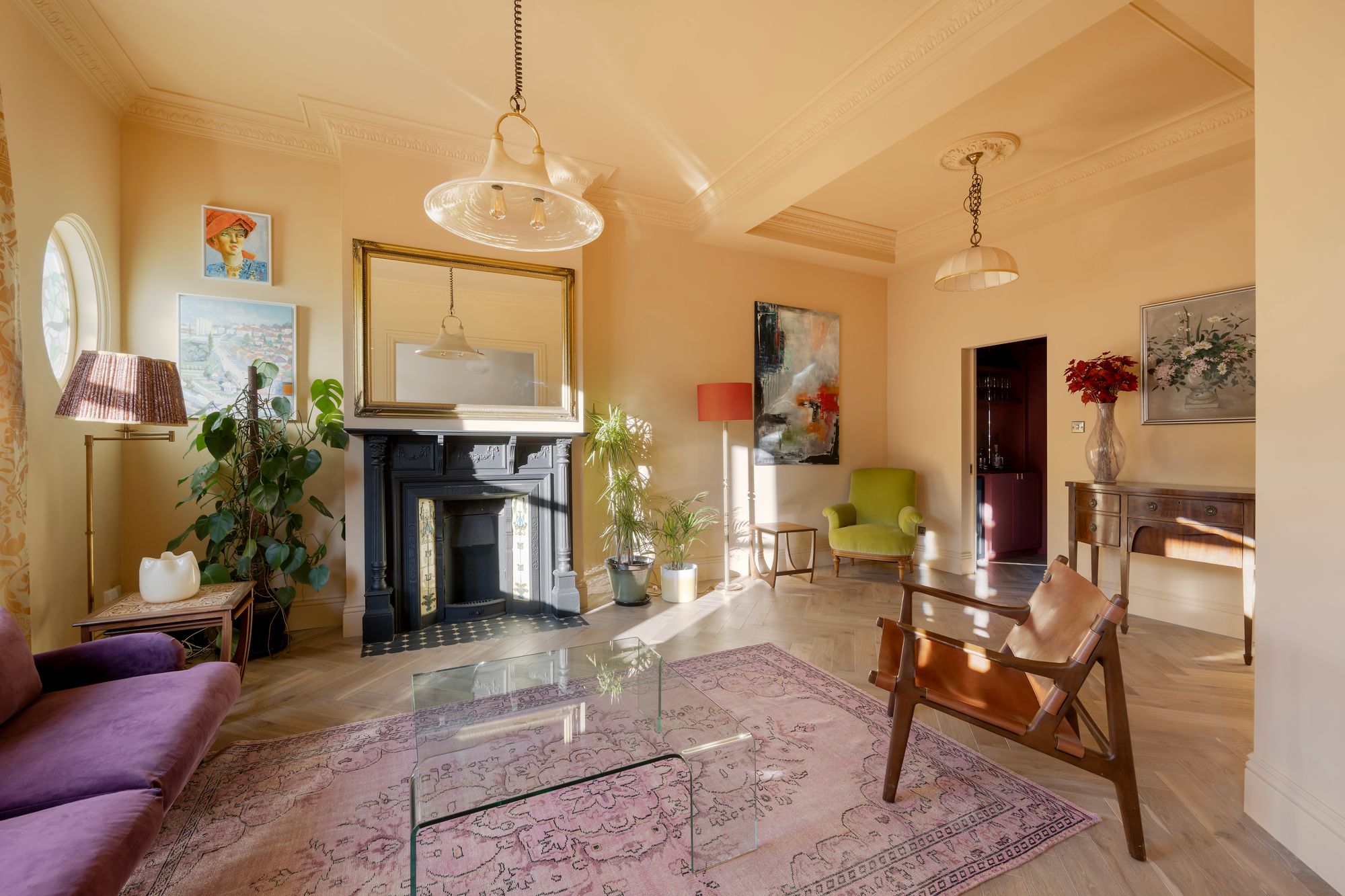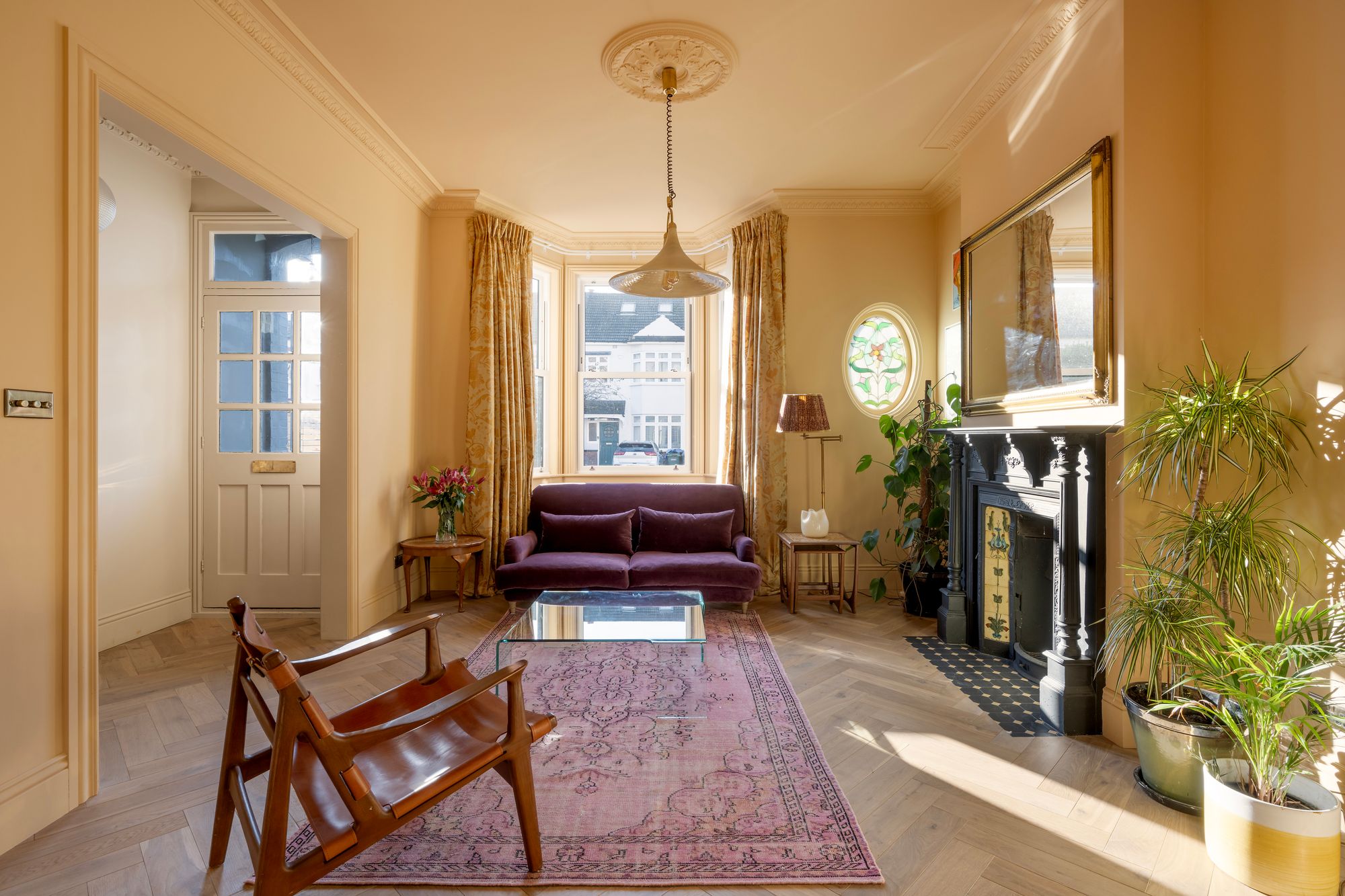 The ground floor features a welcoming entrance hall with ample built-in storage, a guest WC, and an impressive bespoke bar. The elegant front reception room features high ceilings, a charming bay window with stained glass, and an original fireplace. To the rear, a stunning open-plan kitchen, dining, and living space opens onto a landscaped garden through striking sliding doors. A spacious driveway completes the exterior.