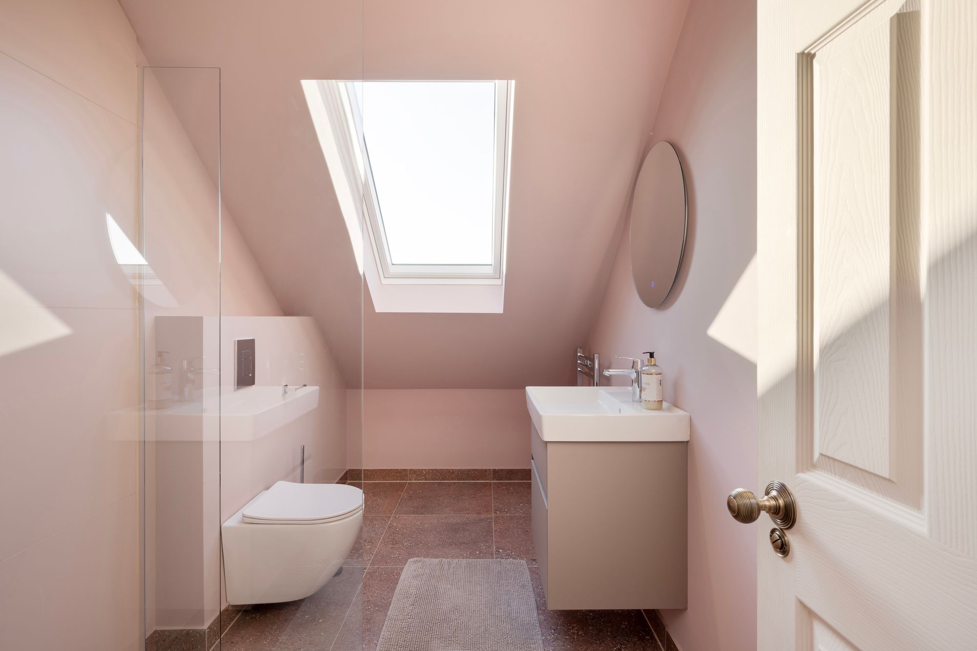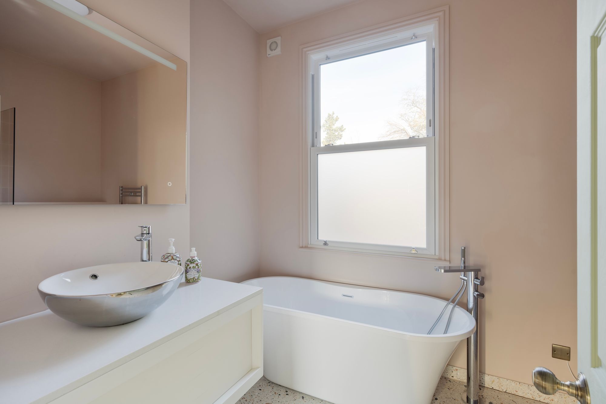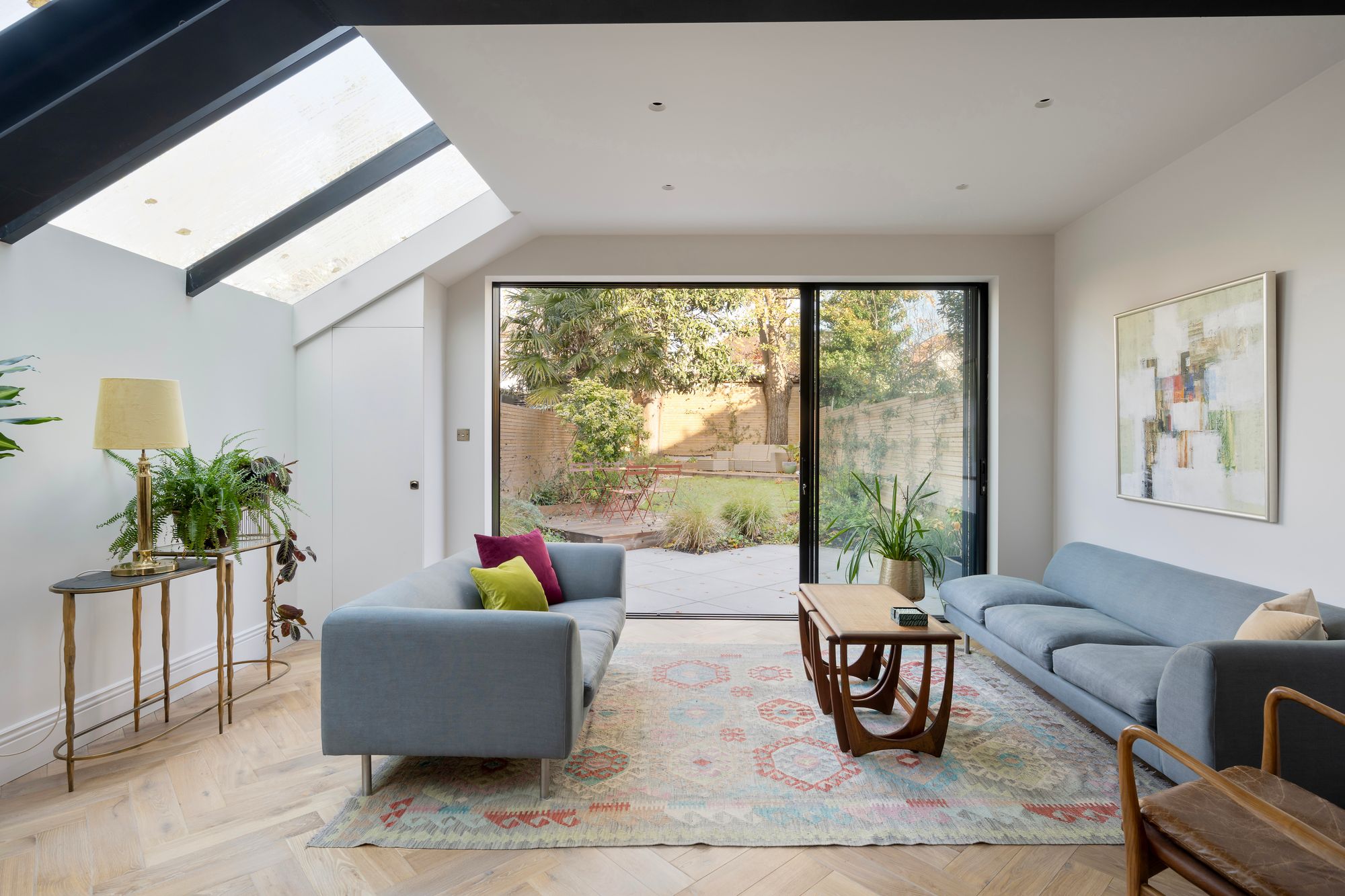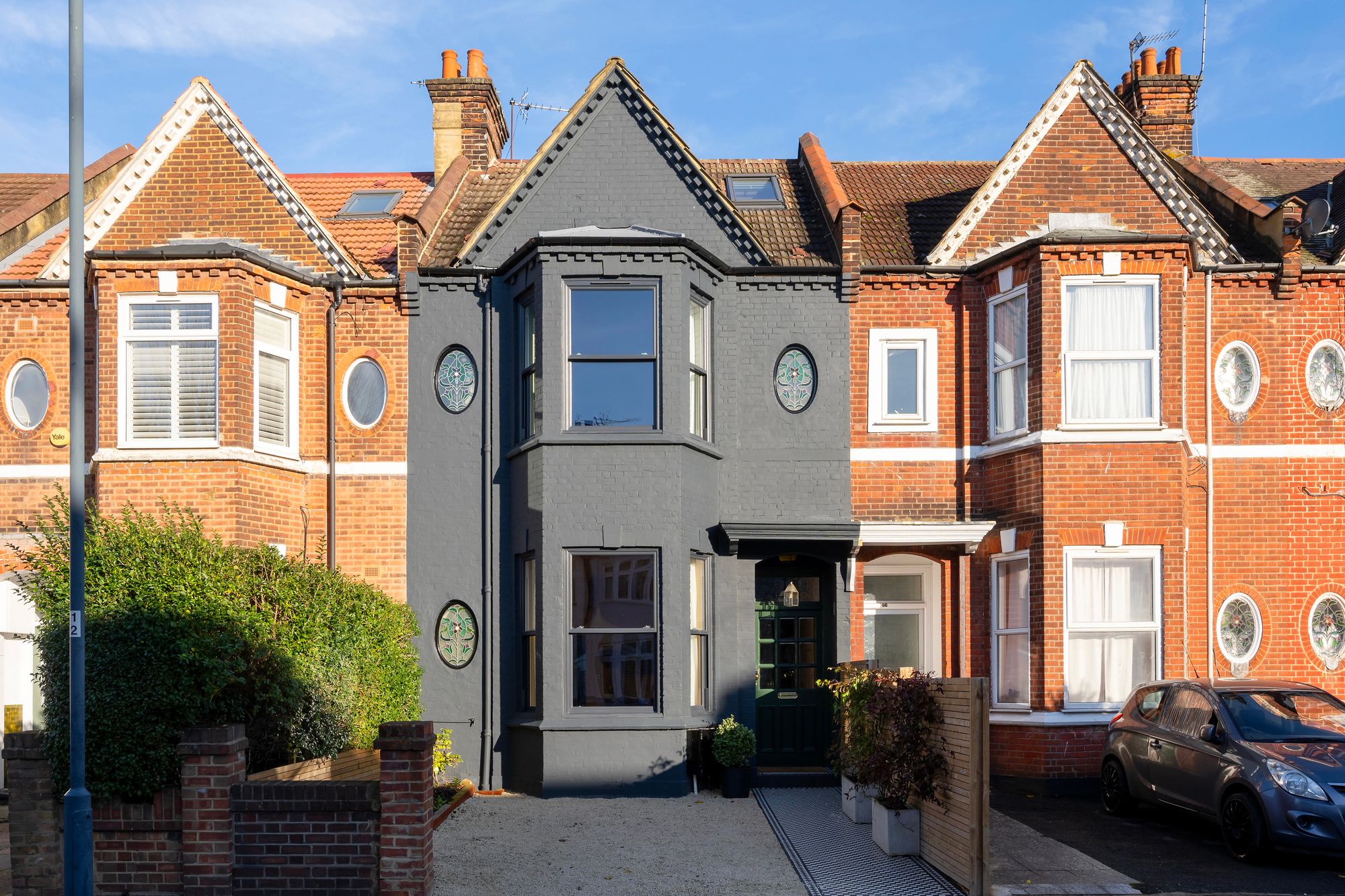 The ground floor features a welcoming entrance hall with ample built-in storage, a guest WC, and an impressive bespoke bar. The elegant front reception room features high ceilings, a charming bay window with stained glass, and an original fireplace. To the rear, a stunning open-plan kitchen, dining, and living space opens onto a landscaped garden through striking sliding doors. A spacious driveway completes the exterior.