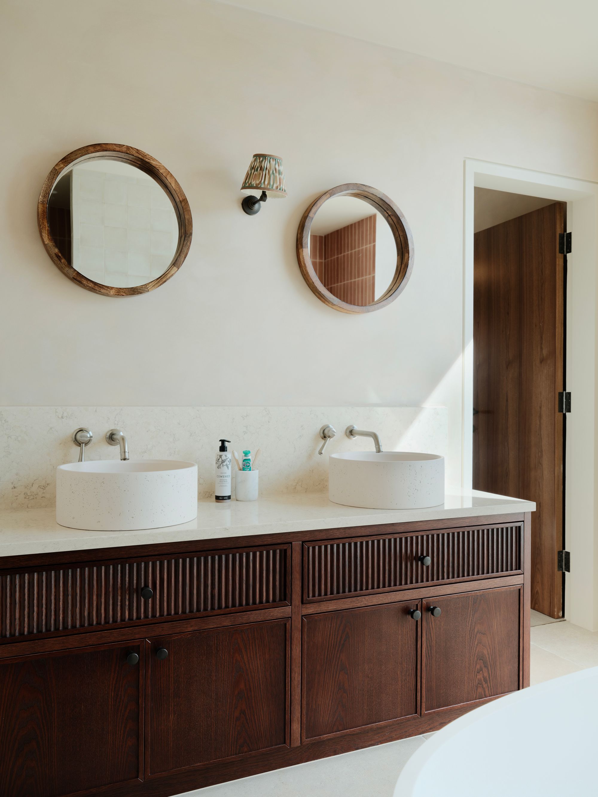 Upstairs, the principal suite spans the first floor, with a generous dressing area, bespoke Kingsbrook joinery and a luxurious en suite complete with Mandarin Stone tiling, freestanding Lusso bath and walk-in rain shower. A second bedroom suite sits opposite, both rooms fitted with wardrobes and air conditioning.