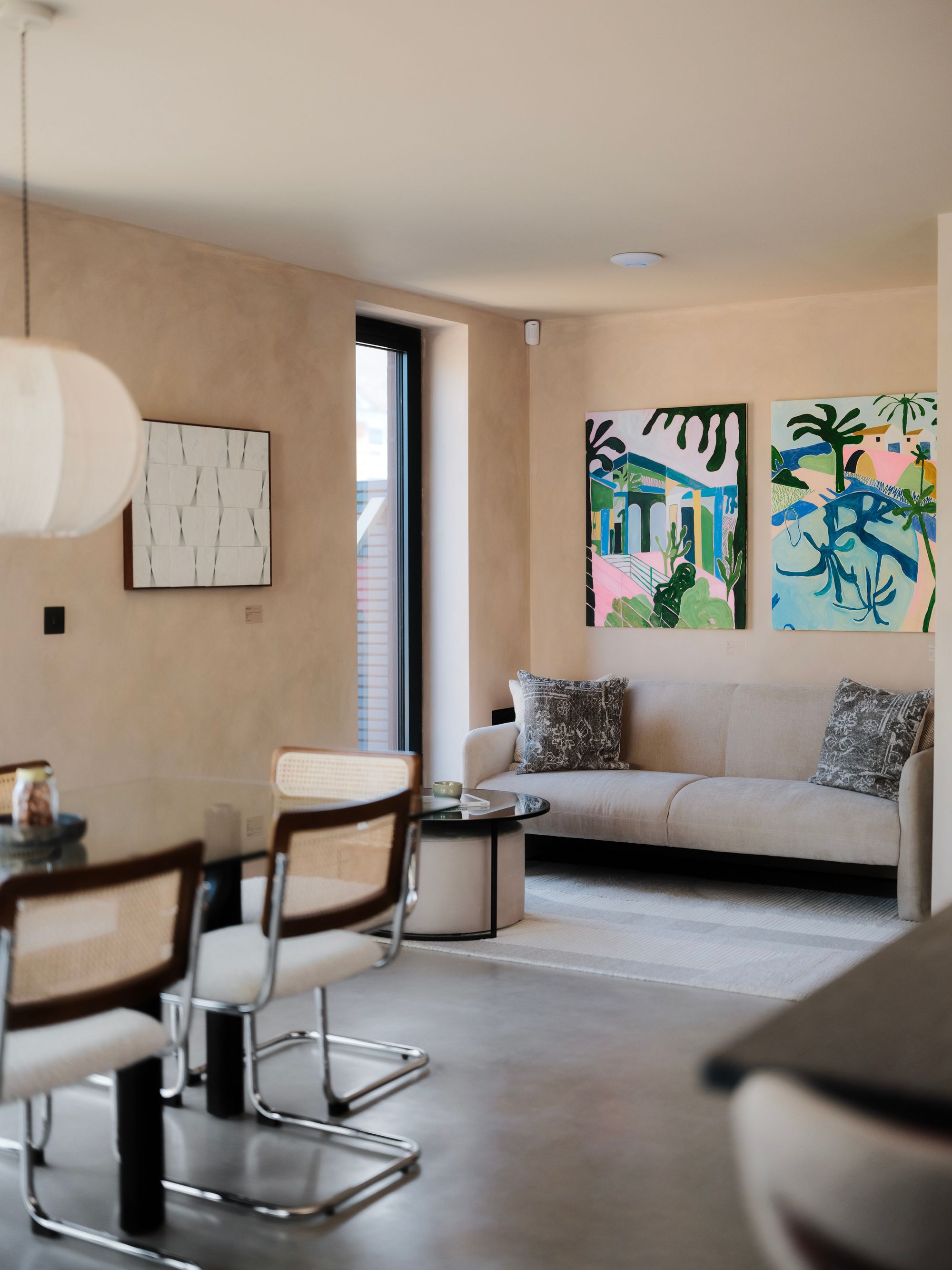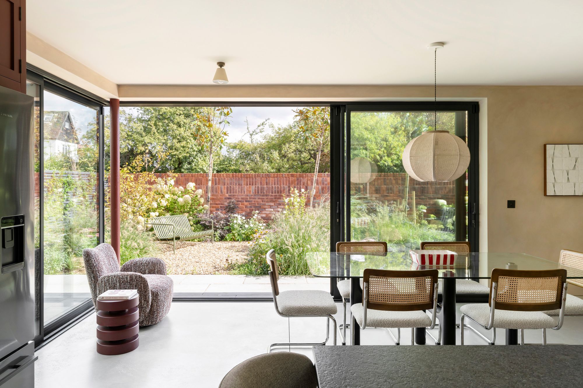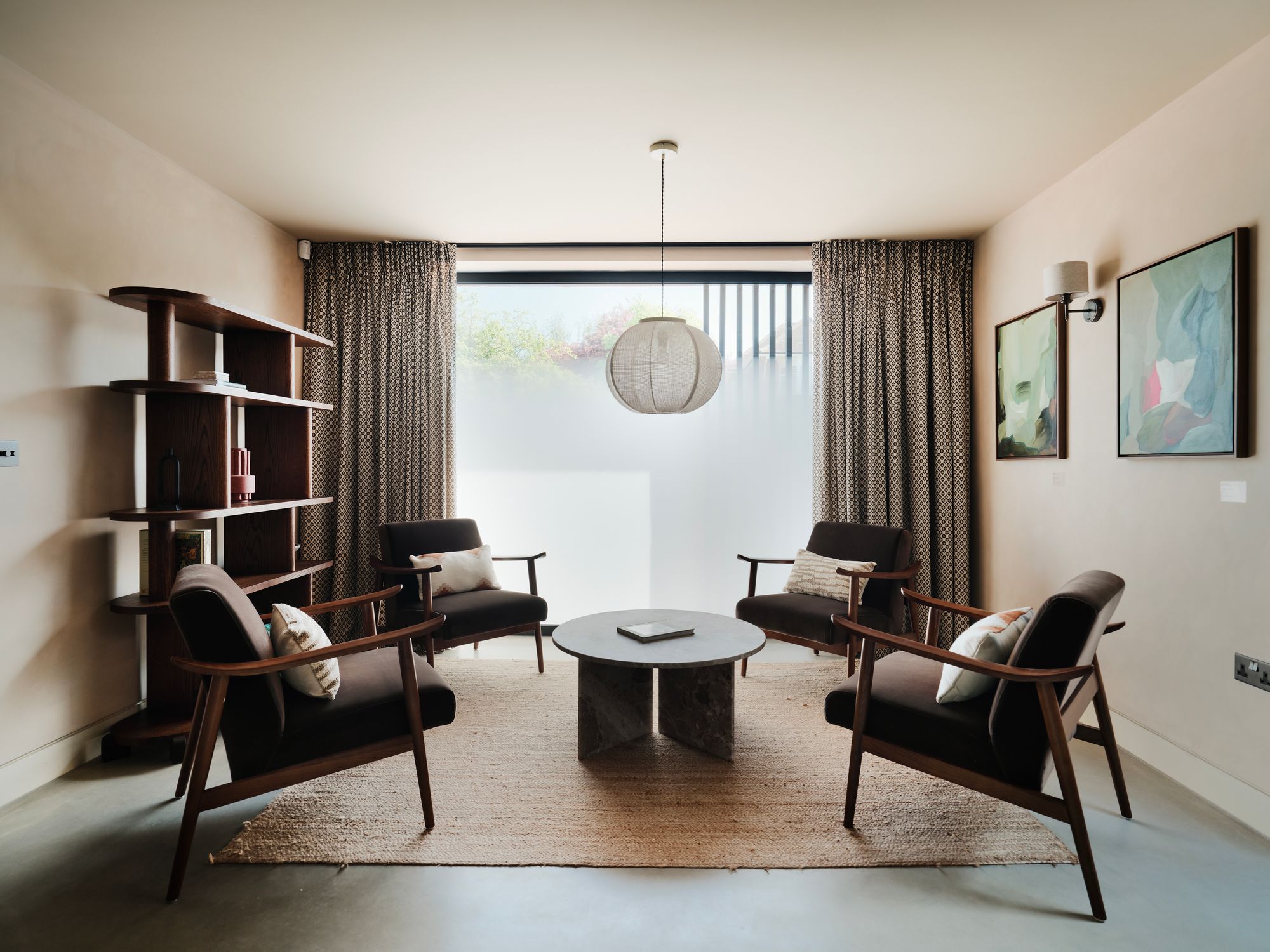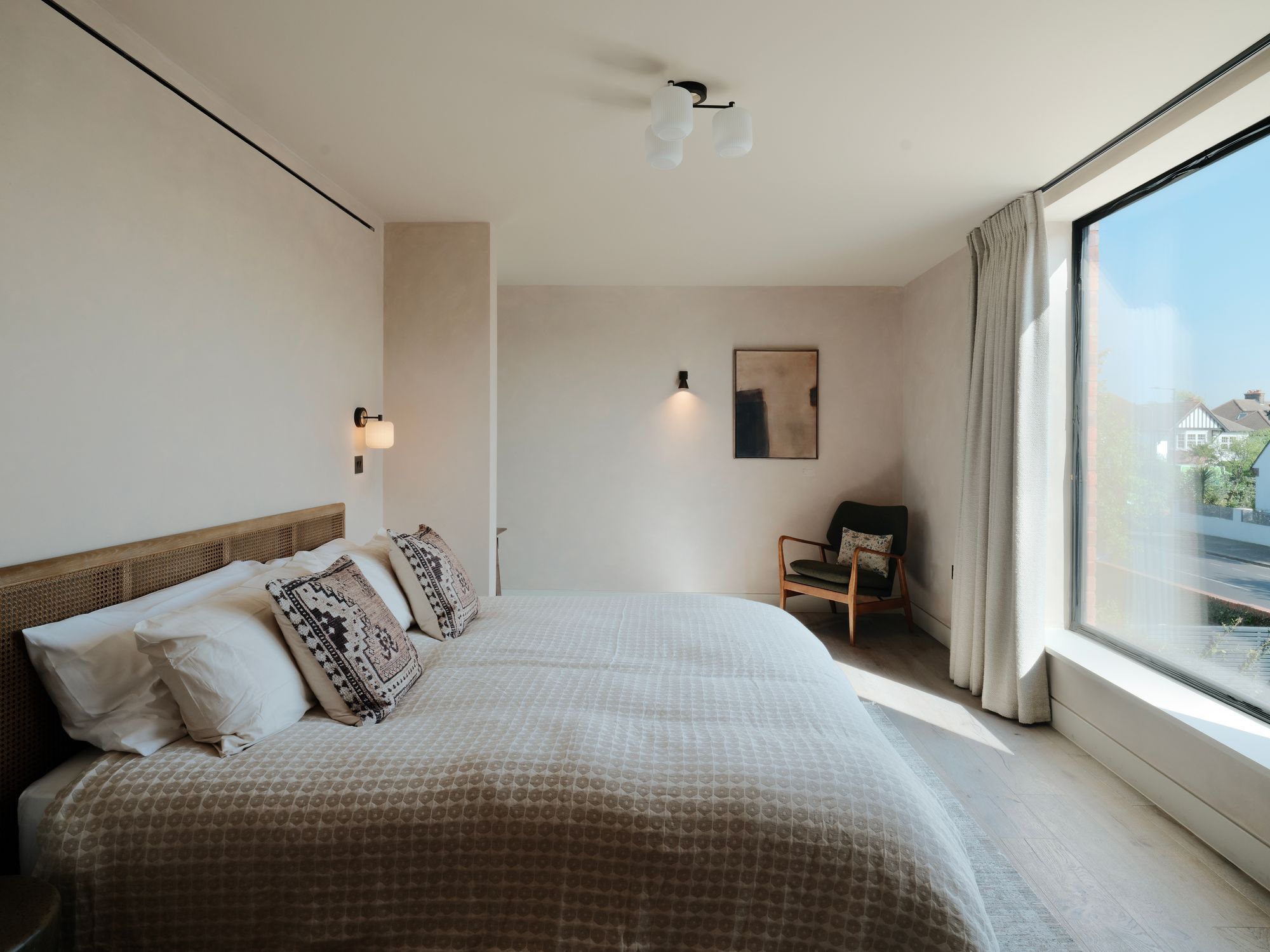 This exceptional home has been designed with architectural intent and finished with an eye for detail. Extending to over 3,100 sq ft across three well-considered floors, the house balances bold design statements with a deft softness that instantly reveals the comfortable family home found within. Cavendish Studios have shaped interiors of quiet confidence. A curved concrete staircase rises sculpturally through the centre, setting the rhythm for spaces defined by light and texture. Expansive glazing, polished concrete, oak flooring and limewashed walls form a calm, modern backdrop.