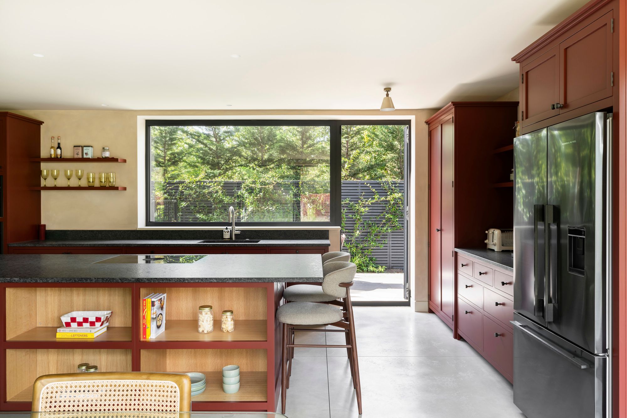 The ground floor is centred on a bespoke Higham kitchen in deep burgundy, paired with granite worktops, a feature island and integrated Neff and Fisher & Paykel appliances. This flows seamlessly into family living spaces and a snug, where full-height doors open to landscaped gardens and private terraces.