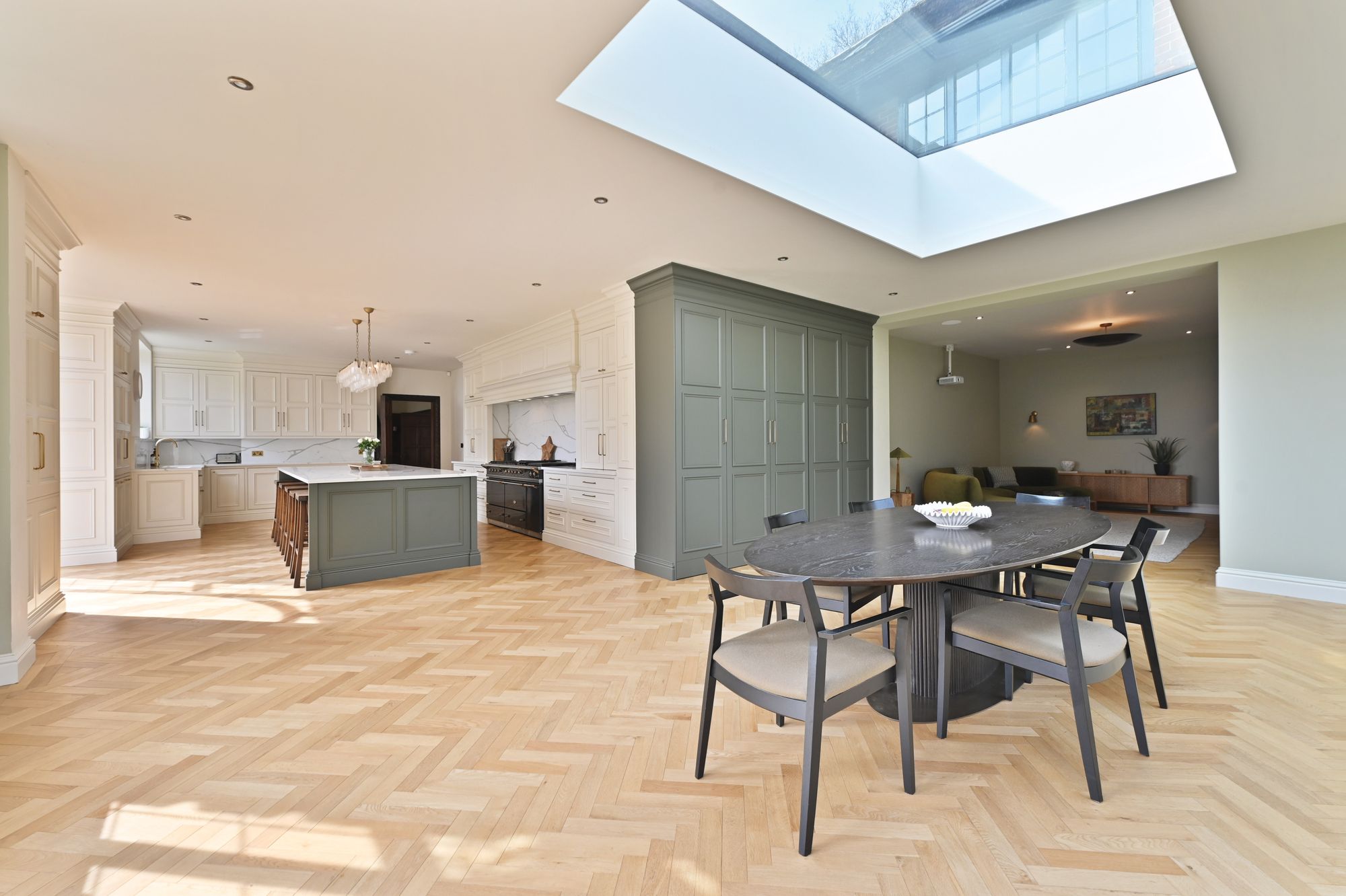 The ground floor flows effortlessly, with a series of elegant, well balanced reception rooms including a drawing room with bay opening onto the garden, a richly panelled dining room with an impressive carved stone fireplace, along with a large study. At its heart; the 42ft by 42ft L-shaped kitchen, breakfast and family room is both functional and refined, centred around a substantial island, an impressive Lacanche Belmont range cooker and finished with integrated appliances. The downstairs is further complemented by a large fitted utility room, WC and access to the adjoining self contained two bedroom annexe with its own kitchen breakfast room, sitting room and shower room.