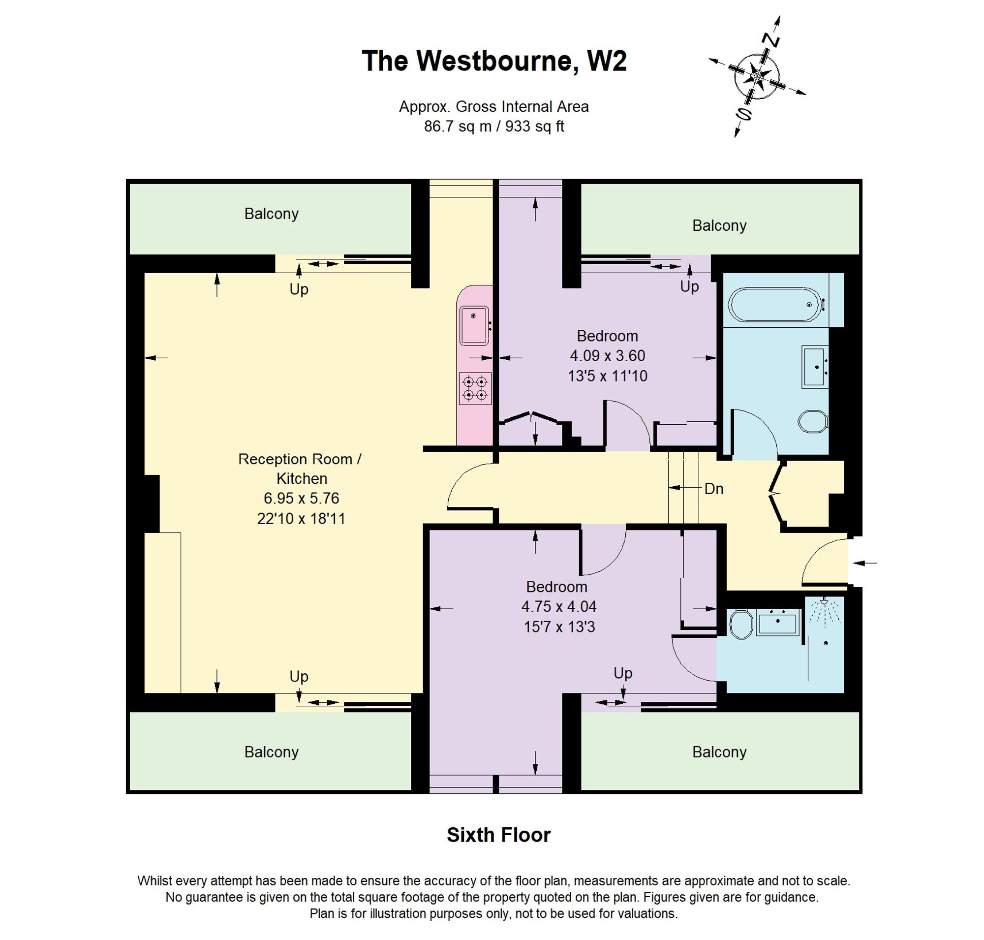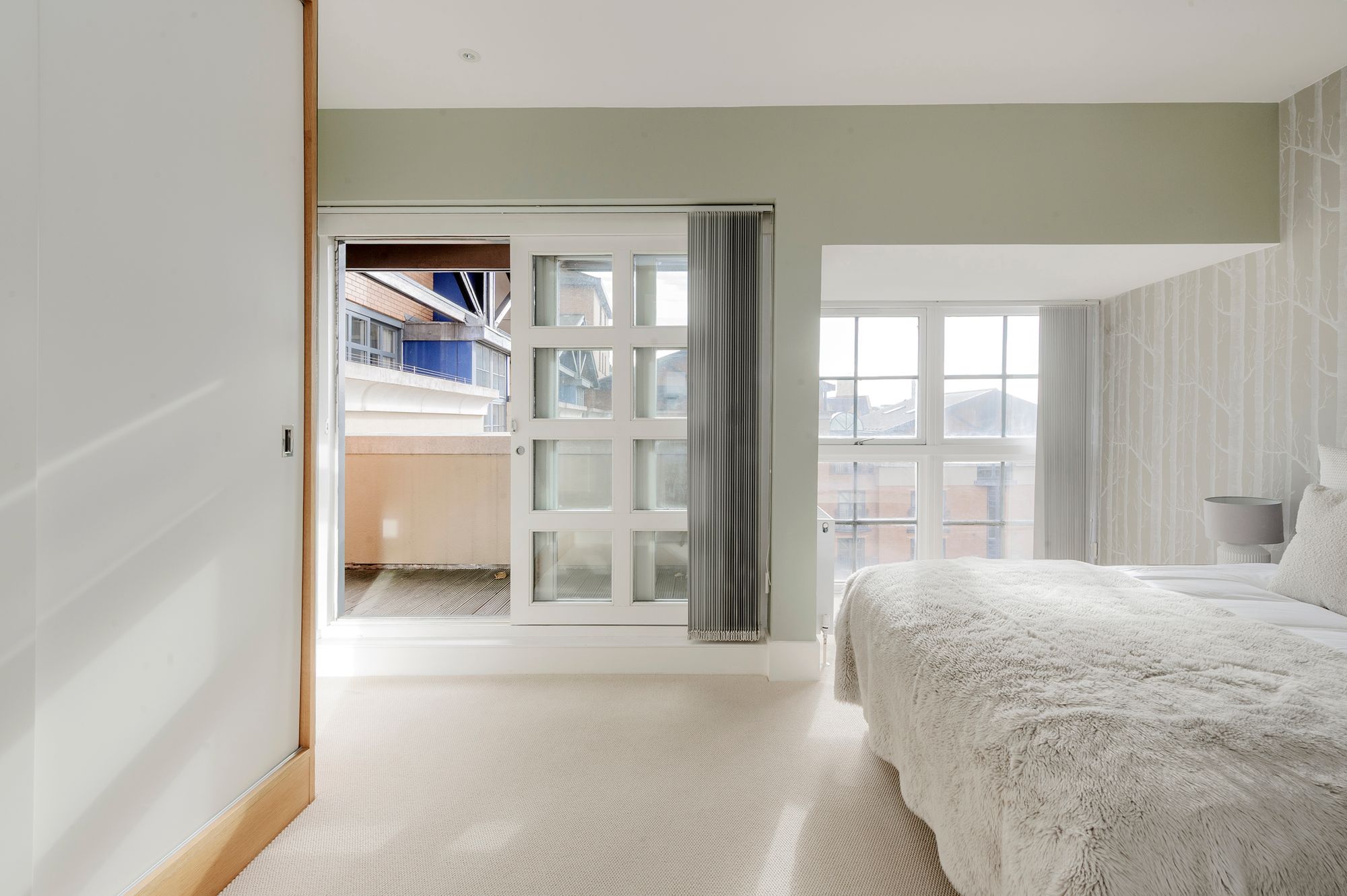 Arranged laterally across 933 sqft, the apartment is defined by its soaring ceilings, full-height windows and balcony access from every principal room, filling the space with natural light and a rare sense of openness. The layout includes a stylish kitchen, neatly positioned in the corner of a large, dual aspect reception space, bookended by generous balconies, two good sized bedrooms, each with their own refined bathrooms and private balconies complete the accommodation.