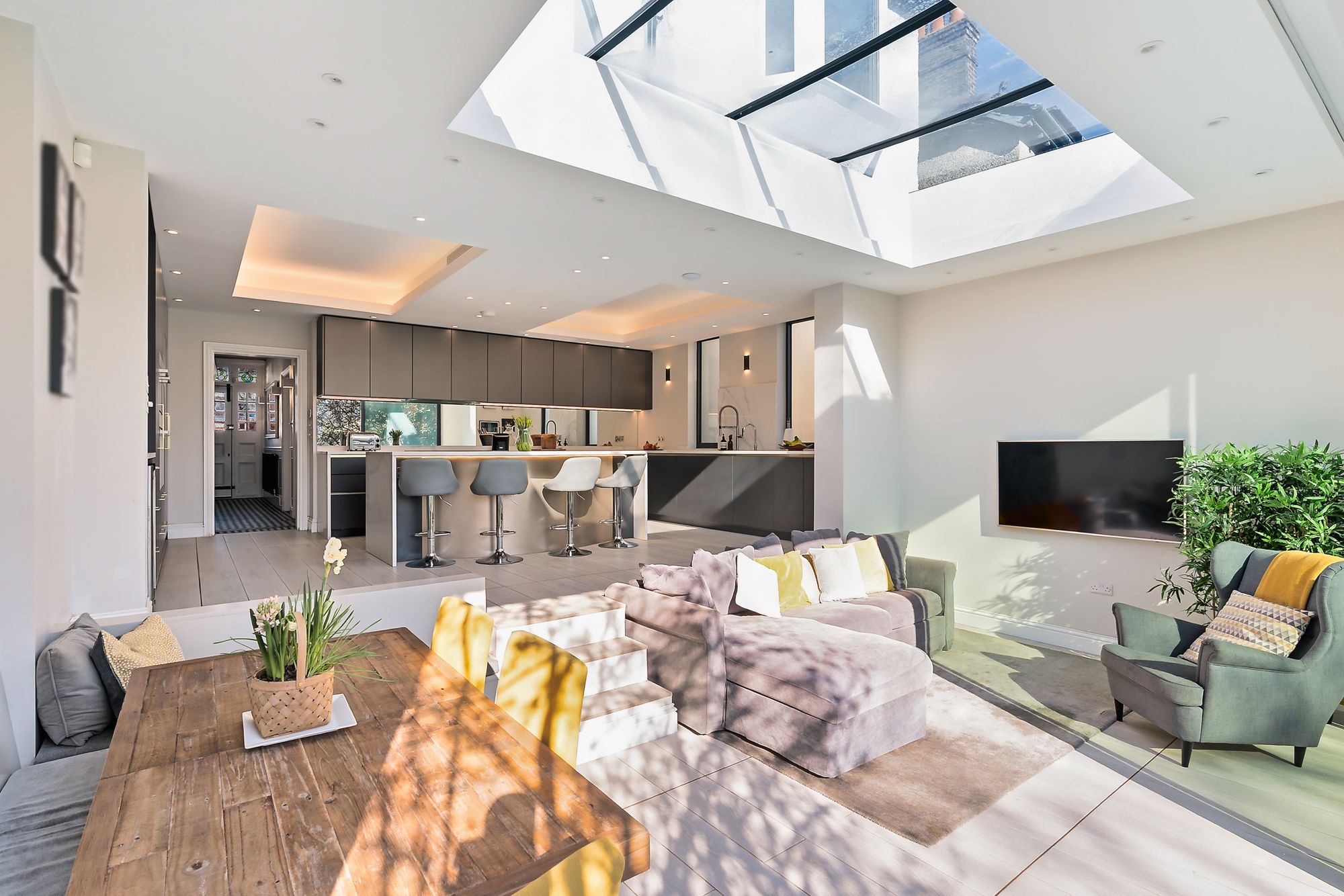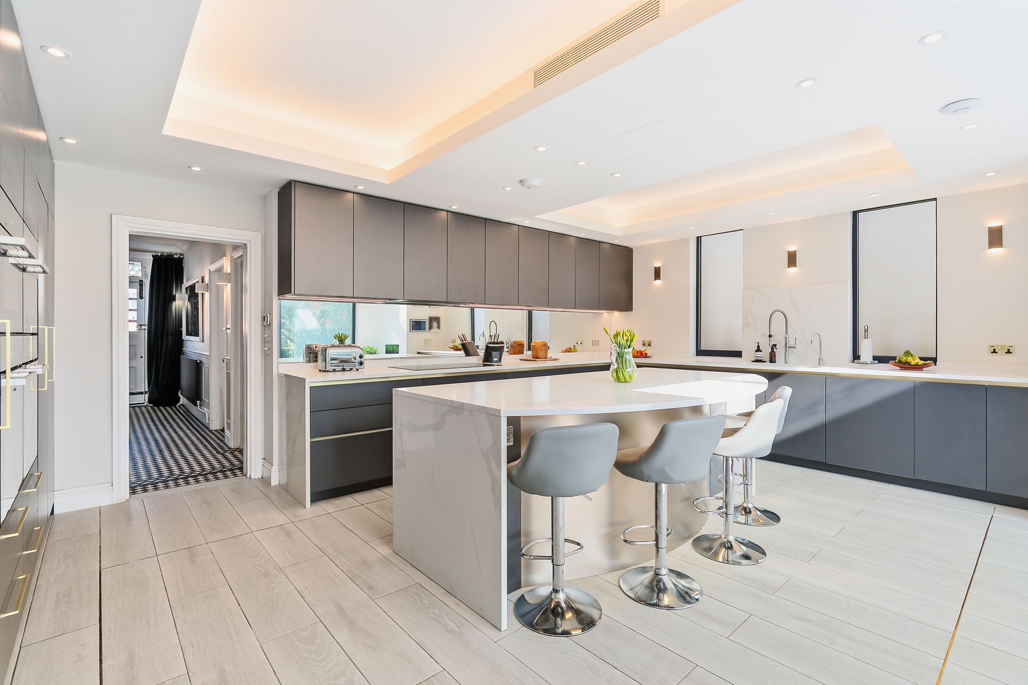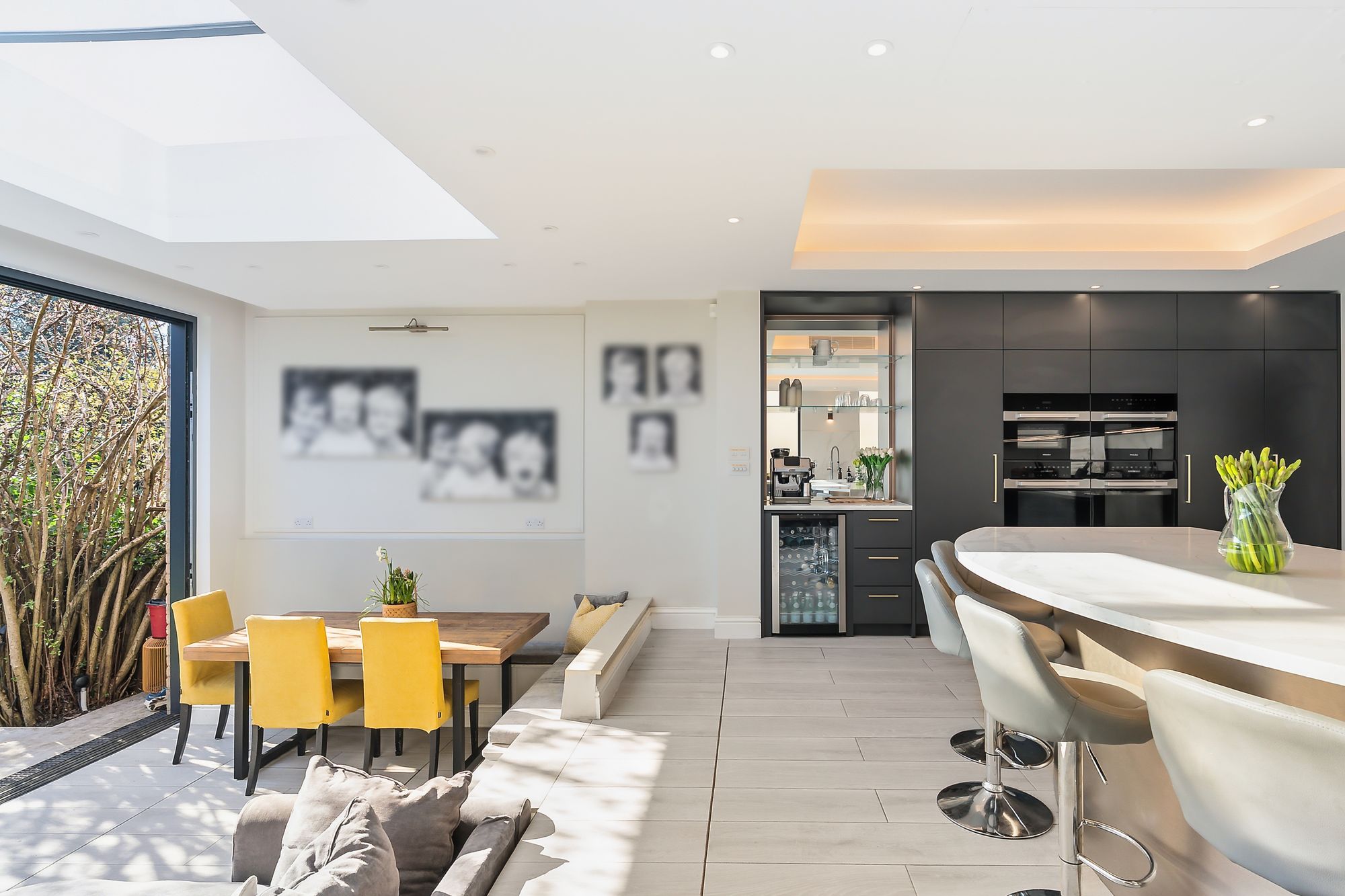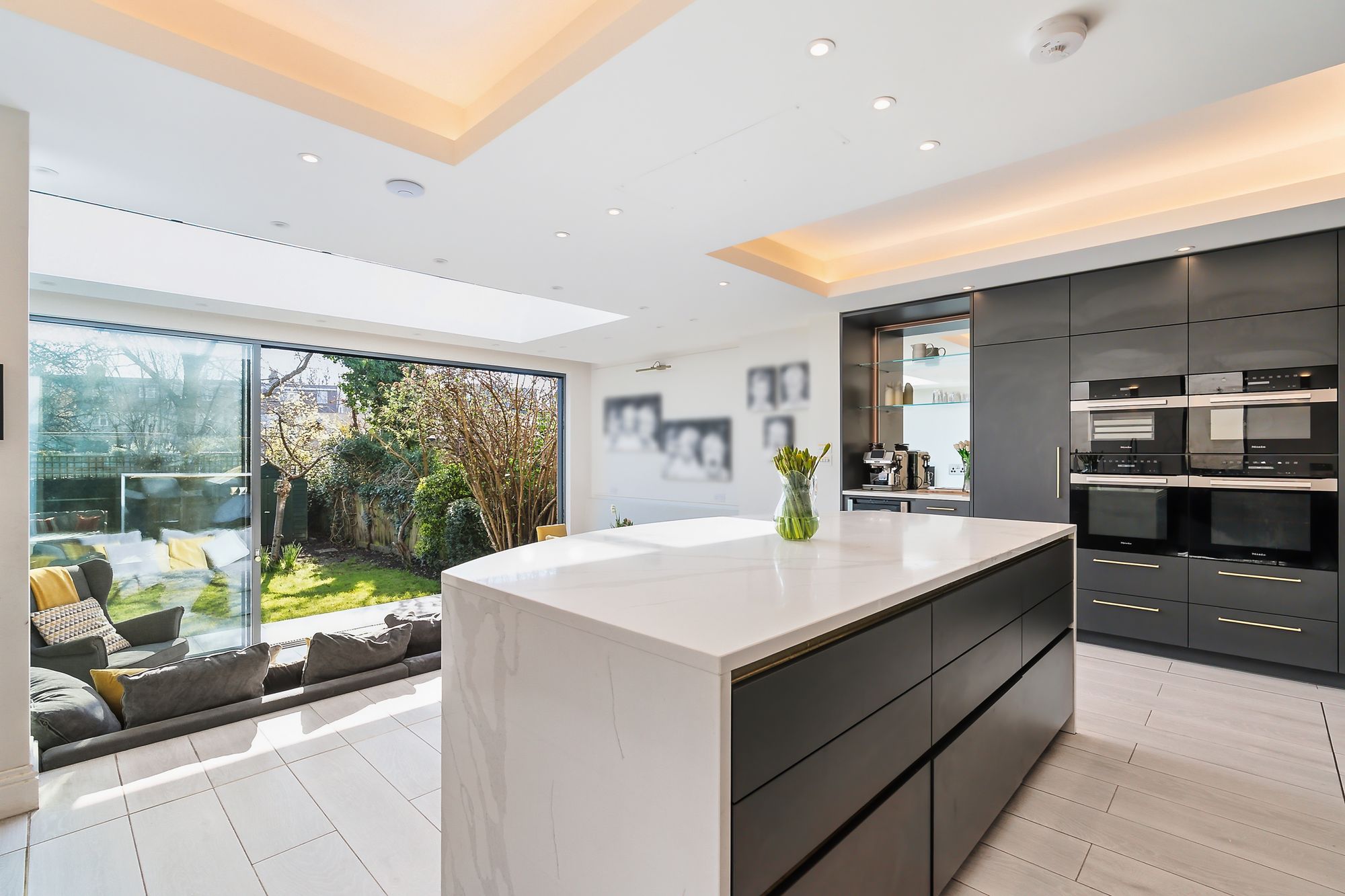 The kitchen/living space is the real hub—sunken seating area with 11-foot ceilings, underfloor heating, and large rear doors that pull you straight out into the garden. A beautifully designed curved island sits at the centre, with loads of storage, integrated appliances, Quooker tap, and a dedicated bar/coffee station. It’s been properly designed for day-to-day living as much as entertaining.