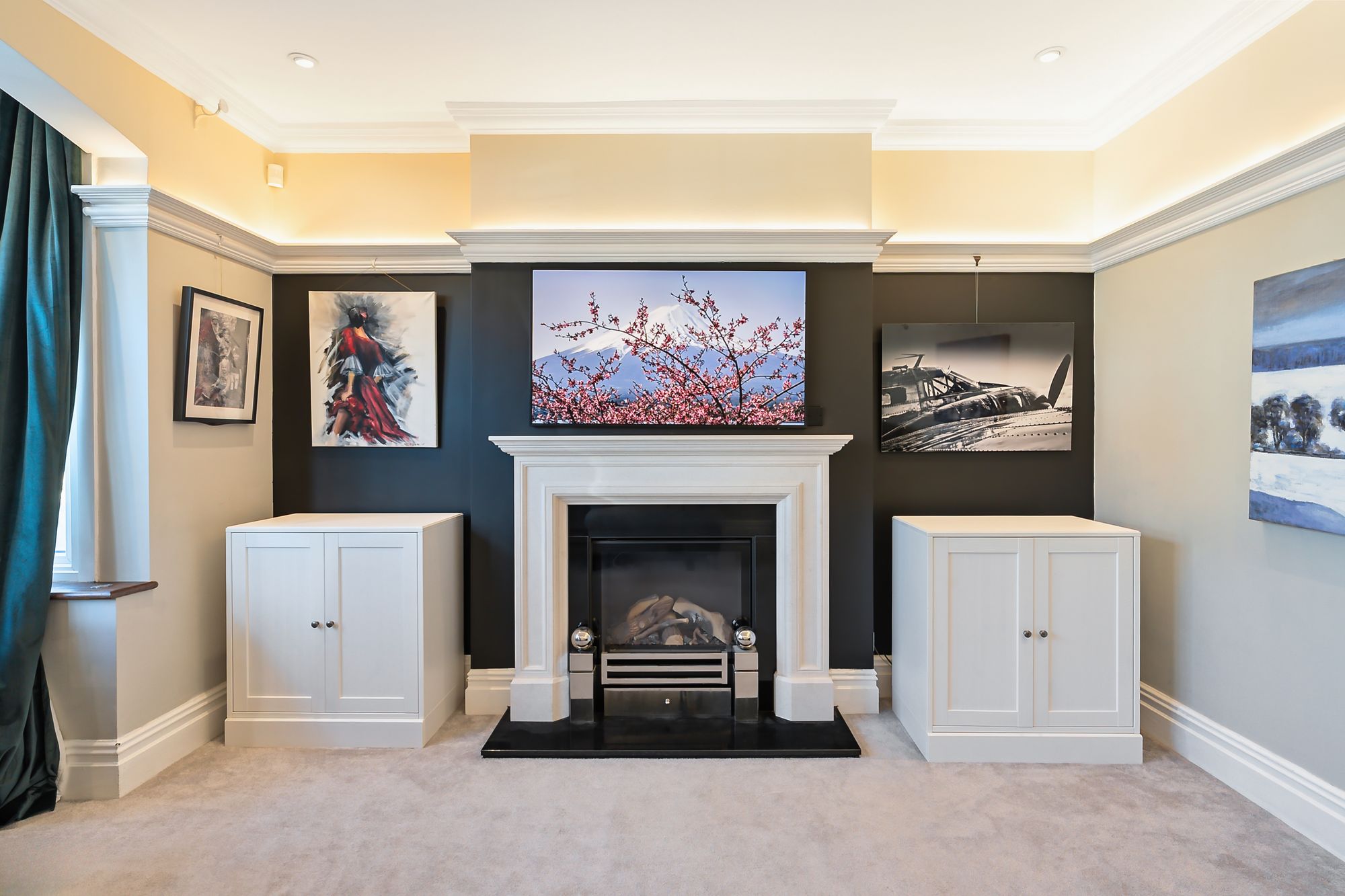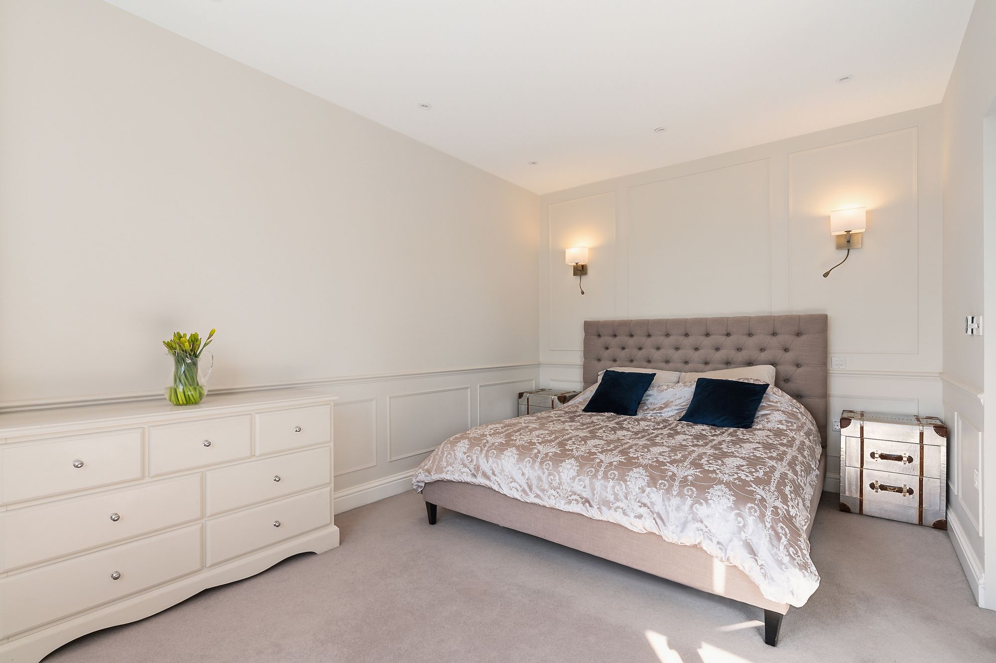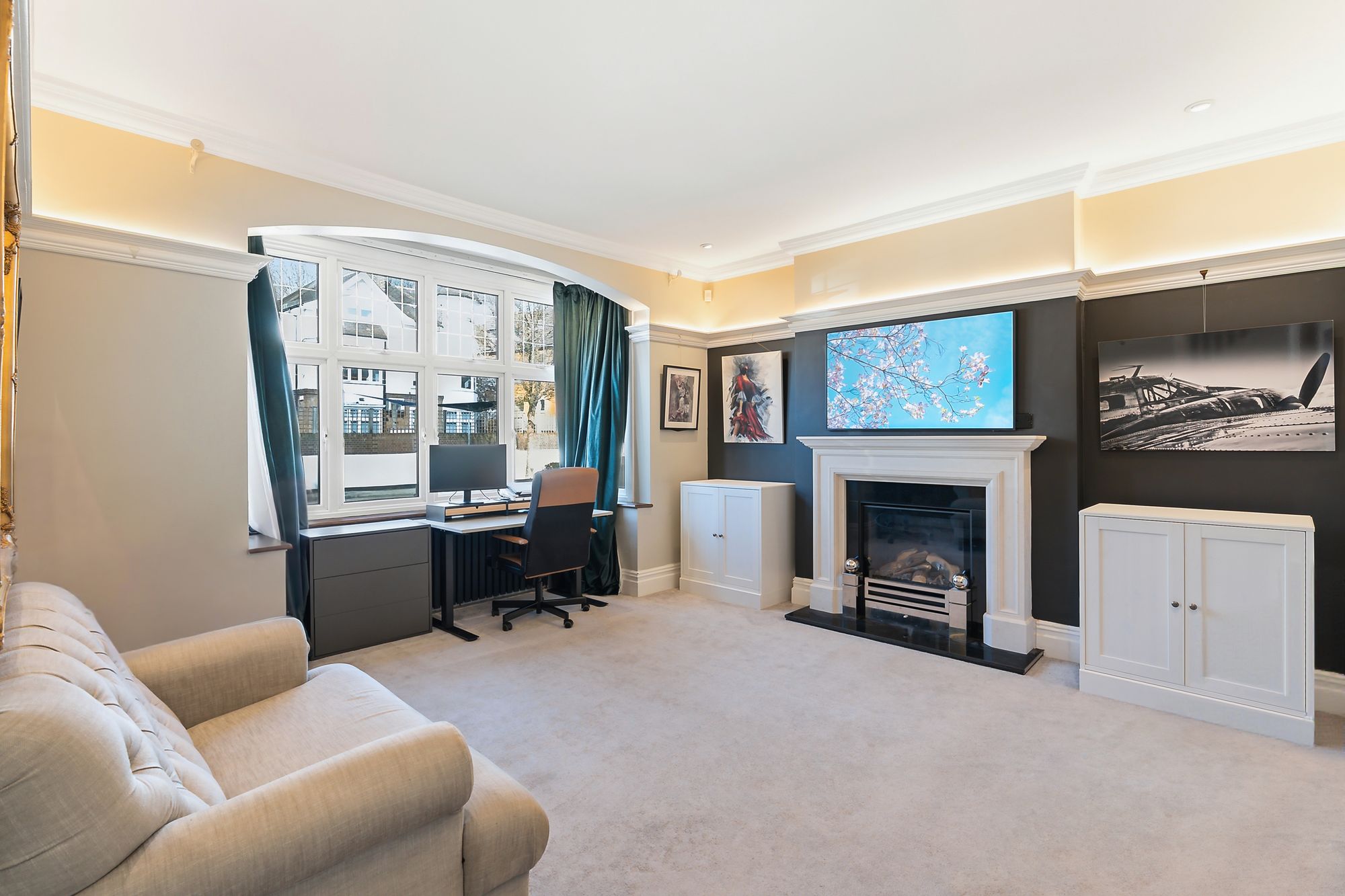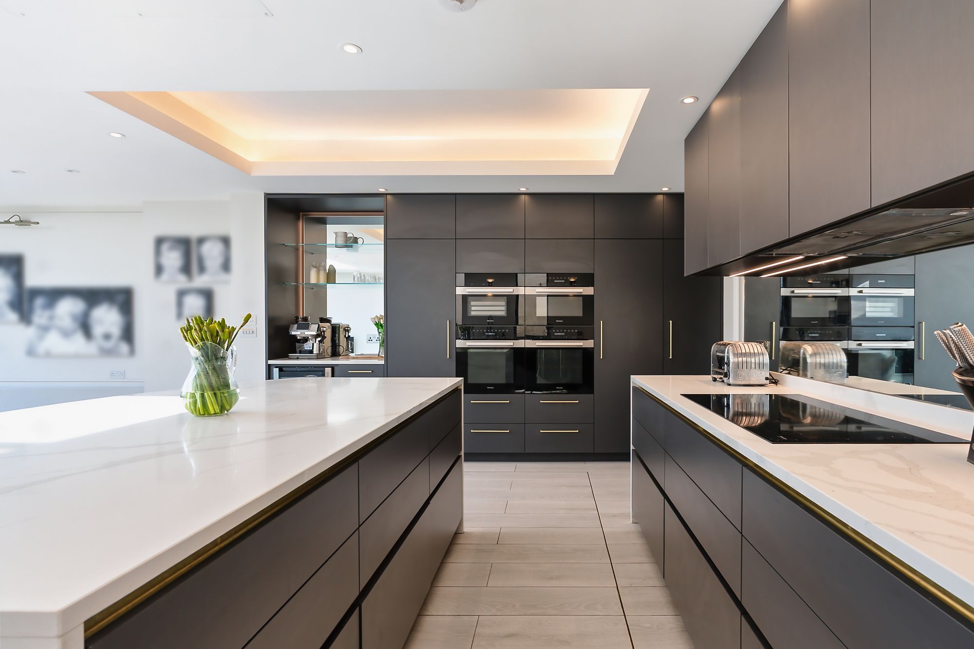 The kitchen/living space is the real hub—sunken seating area with 11-foot ceilings, underfloor heating, and large rear doors that pull you straight out into the garden. A beautifully designed curved island sits at the centre, with loads of storage, integrated appliances, Quooker tap, and a dedicated bar/coffee station. It’s been properly designed for day-to-day living as much as entertaining.
