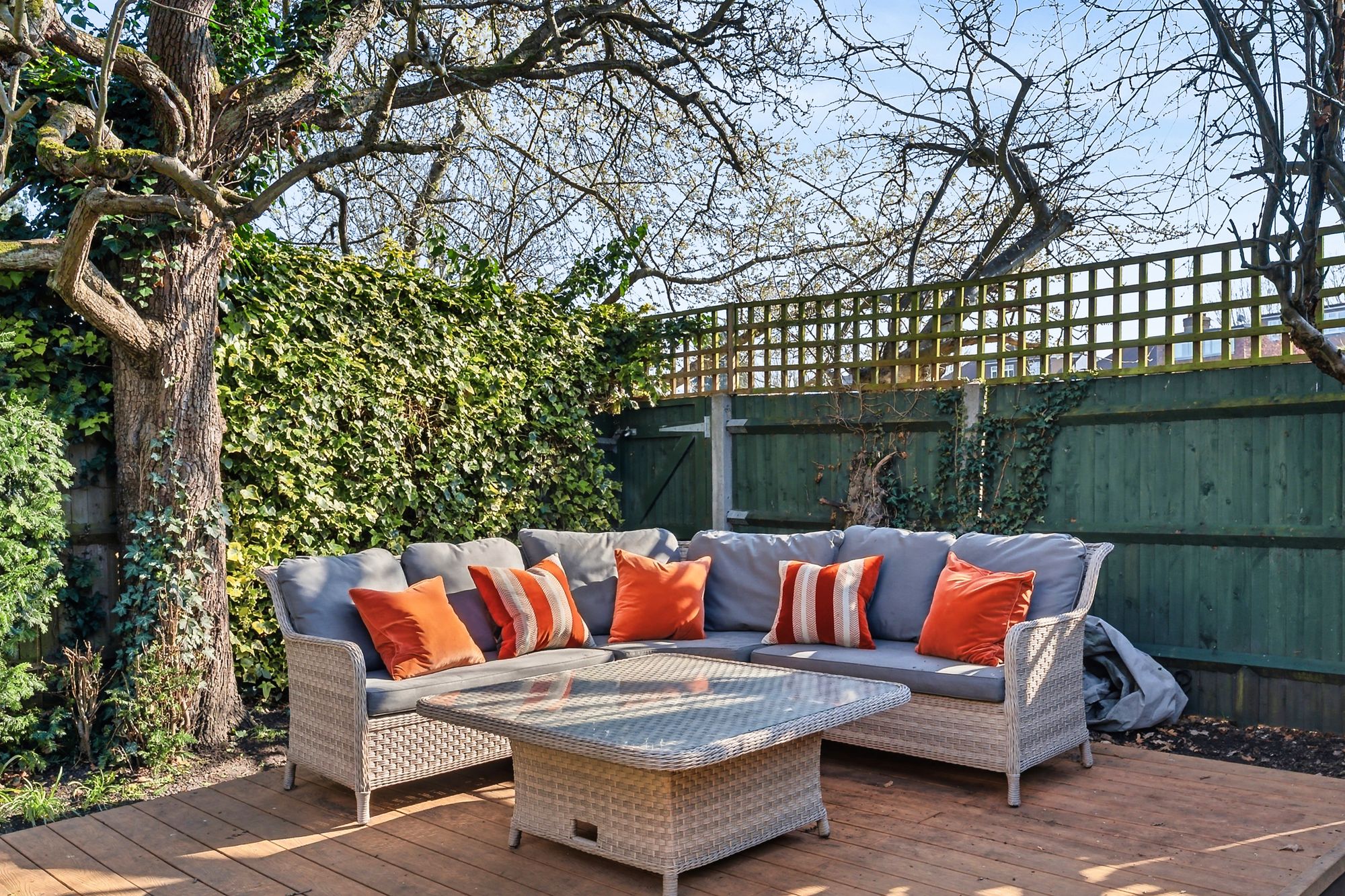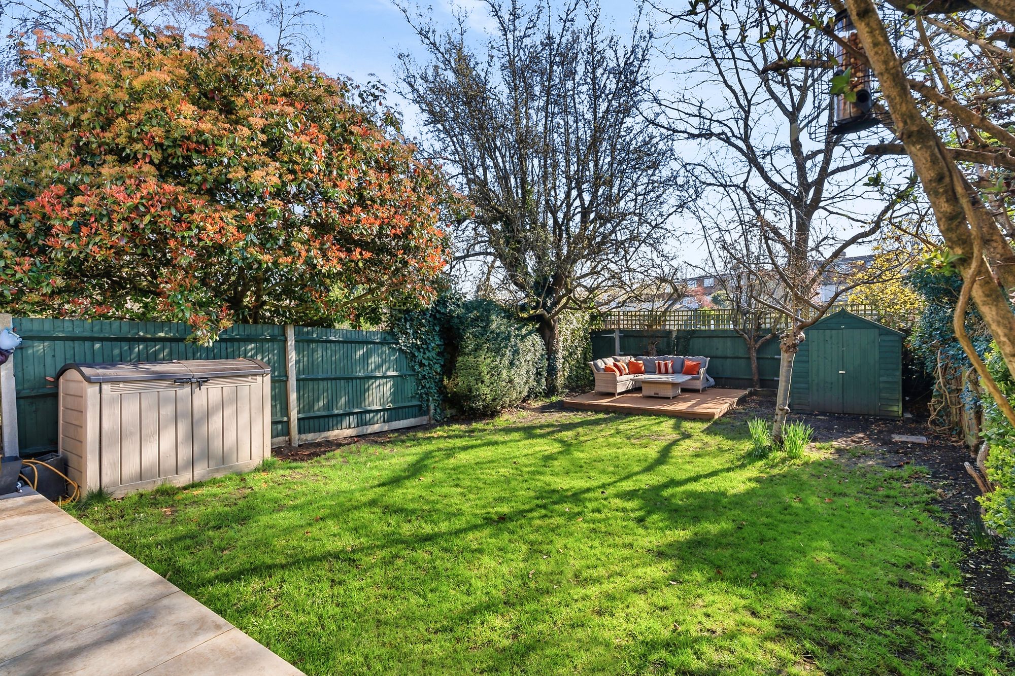 Outside, the garden is mature and well established with apple and pear trees, a decked seating area, and that direct rear gate leading straight onto the Home Guard grounds and indoor pool—a rare setup locally and something that genuinely enhances day-to-day living.