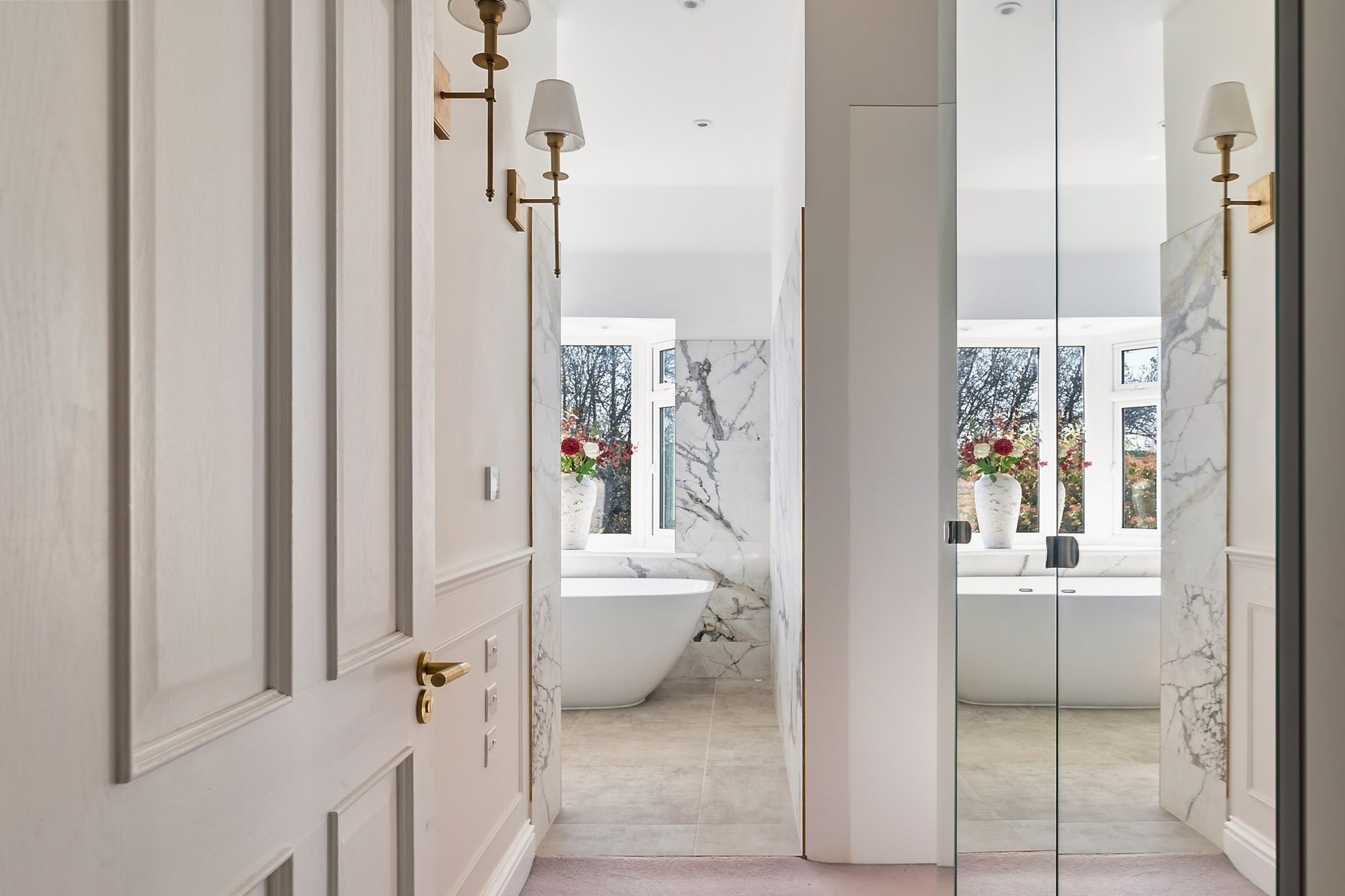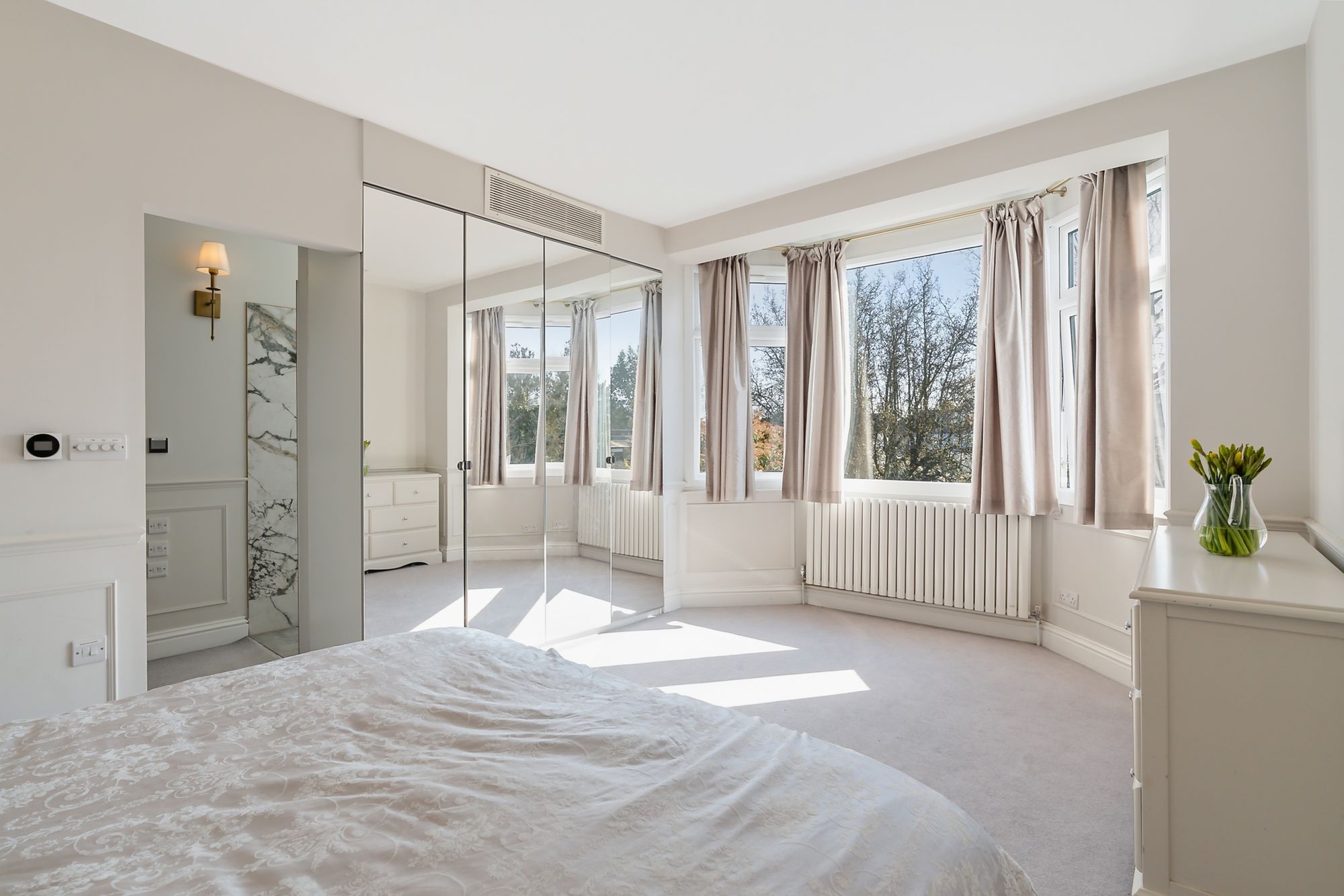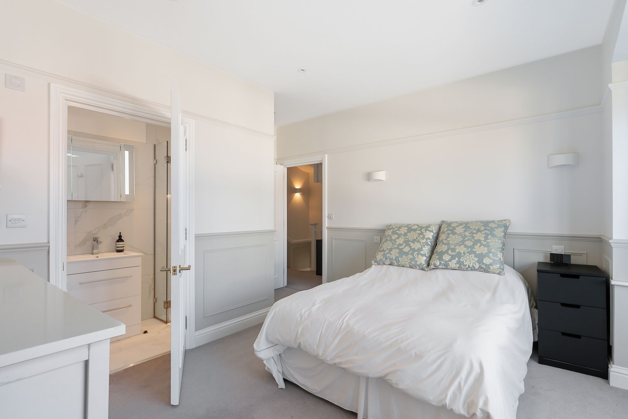 Upstairs, the principal suite feels like its own space—great storage, green views to the rear, and a high-spec bathroom with double shower, large bath, underfloor heating, and integrated speakers. There’s also a further double bedroom with its own ensuite shower room, along with a single bedroom/study—ideal as a nursery, home office, or guest space.