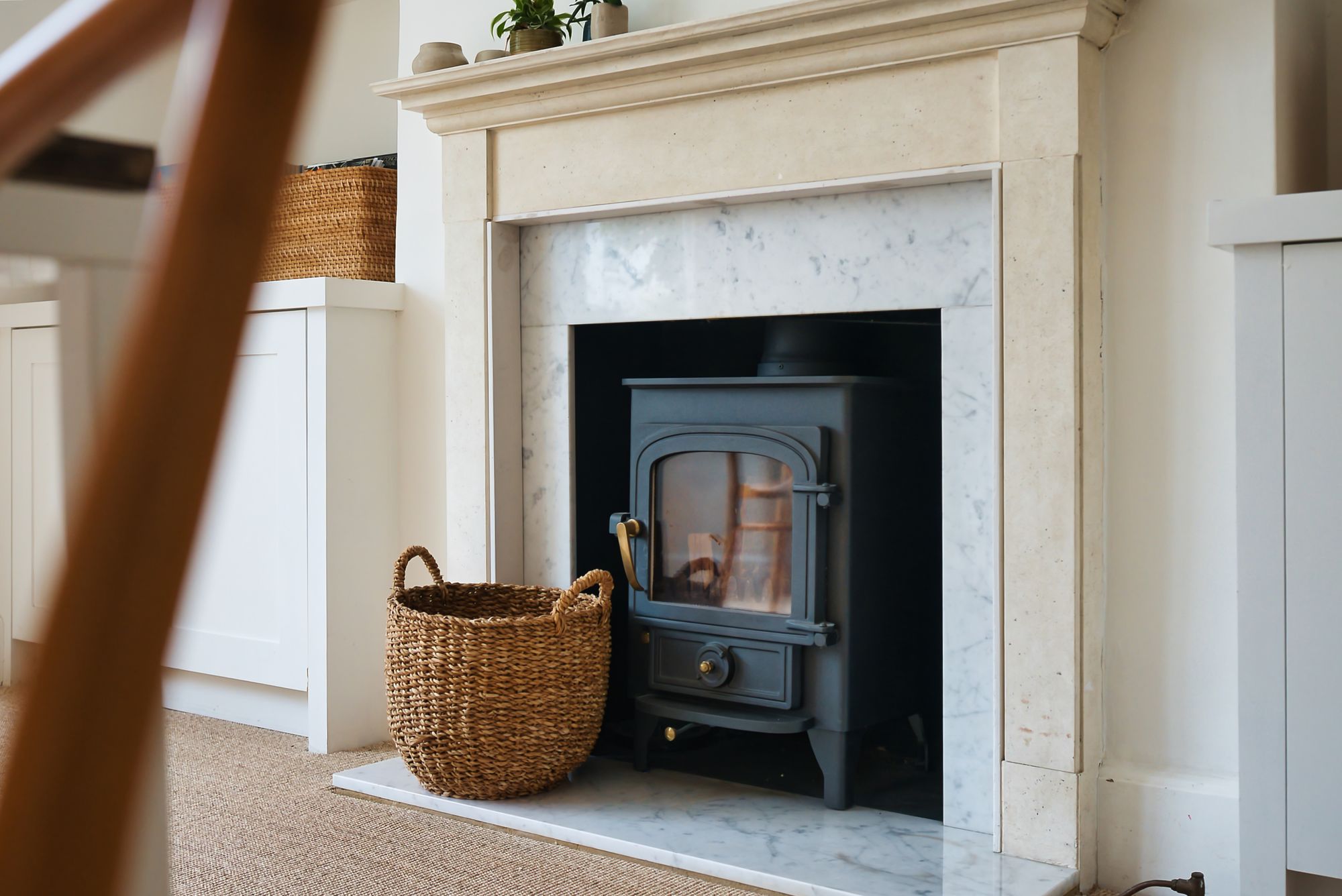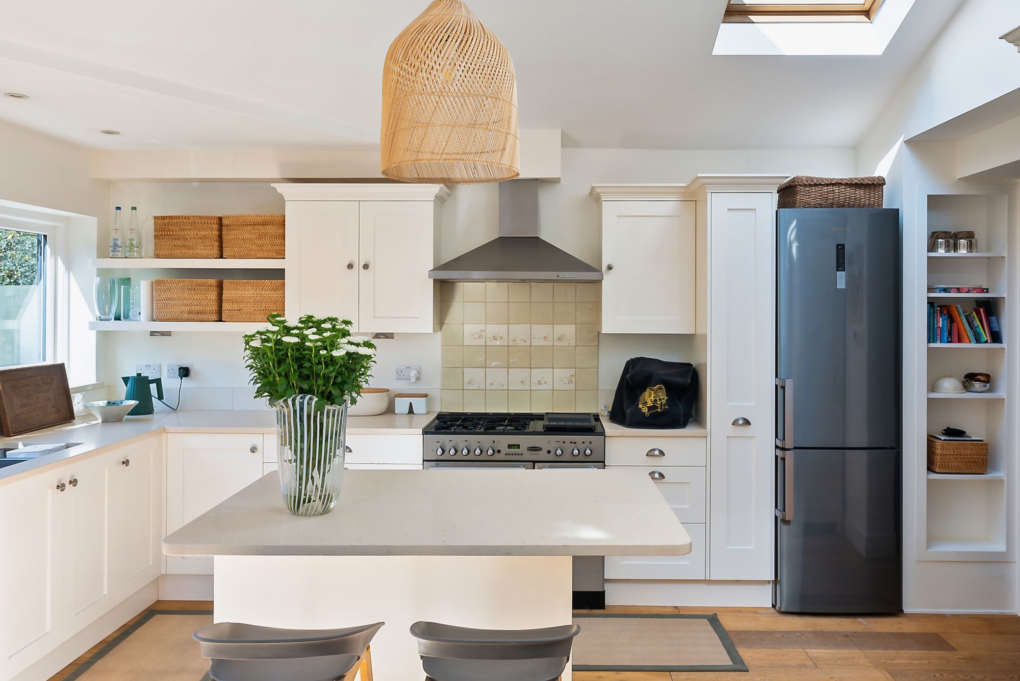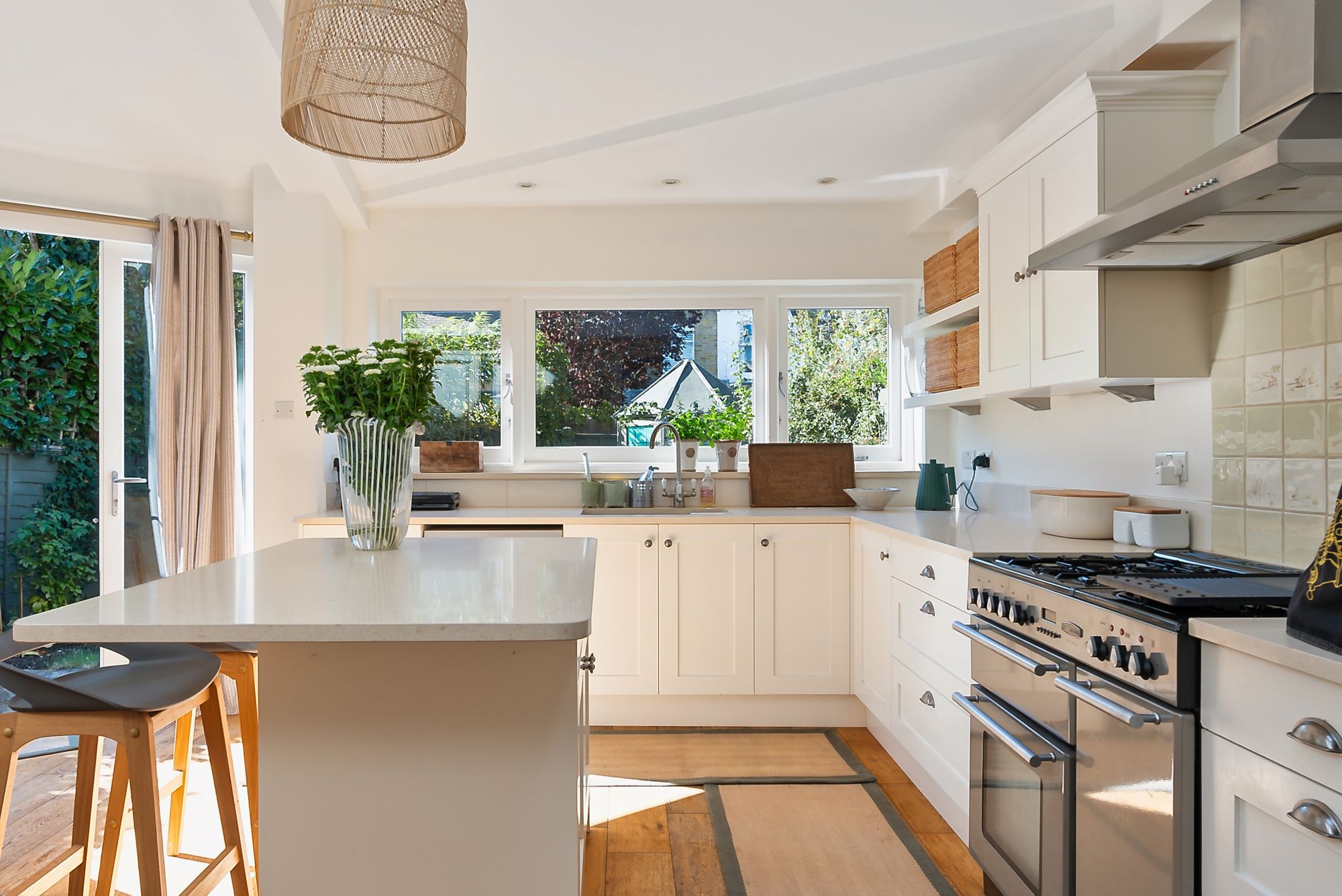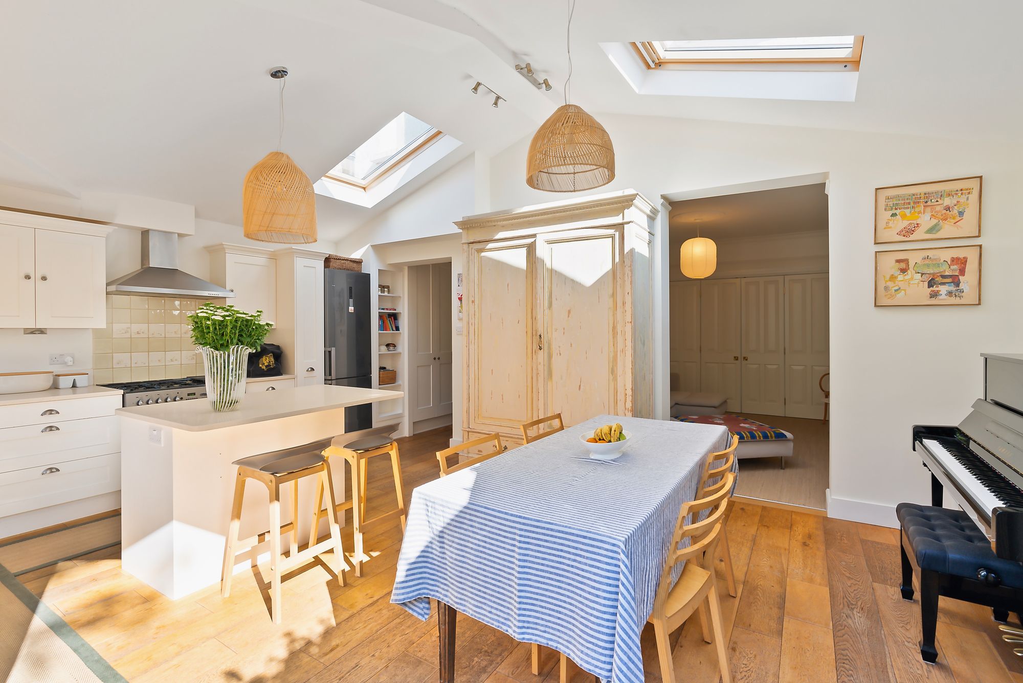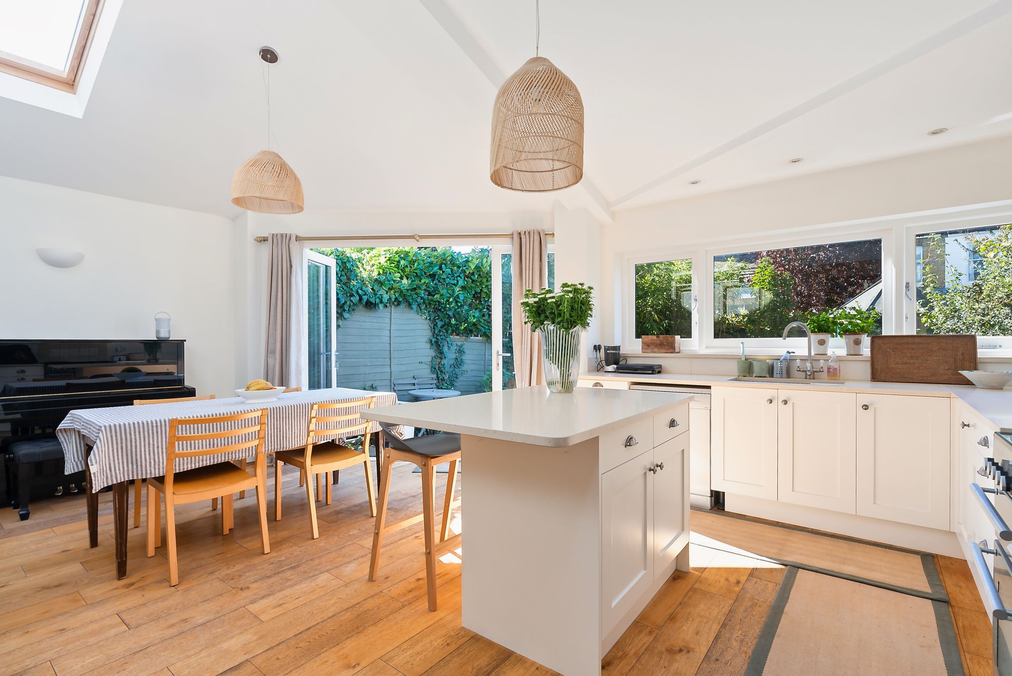 Inside, the layout works beautifully for family life and entertaining. There’s a welcoming hallway, a large double reception room, and a stylish open-plan kitchen and dining area. The kitchen features underfloor heating, plenty of storage, and high-quality appliances including a Samsung fridge-freezer, Siemens dishwasher, and a Rangemaster cooker. Wood flooring runs through the hallway and kitchen, and the west-facing garden catches the afternoon sun perfectly.